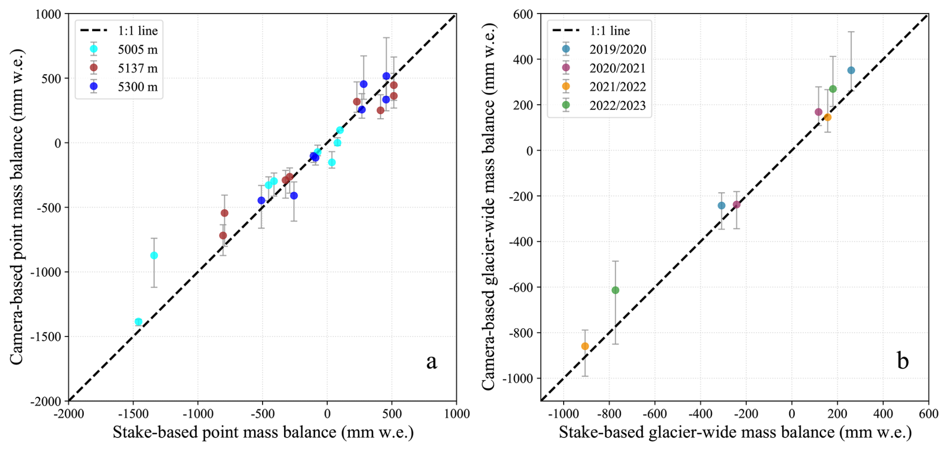 At the glacier-wide scale (Fig. 4b), the camera-based seasonal mass balances exhibit a robust linear correlation with the stake-based counterparts (e.g., R2=0.98), with almost all in-situ stake-based values falling well within the uncertainty bounds of the camera-based estimates. The mean discrepancy between the two datasets is 62±54 mm w.e., indicating high consistency between the camera-based method and the glaciological stake method. This robust agreement not only validates the reliability of time-lapse camera observations for quantifying glacier mass balance but also establishes a solid foundation for investigating temporal evolution characteristics of glacier-wide mass changes for the Kangxiwa Glacier.