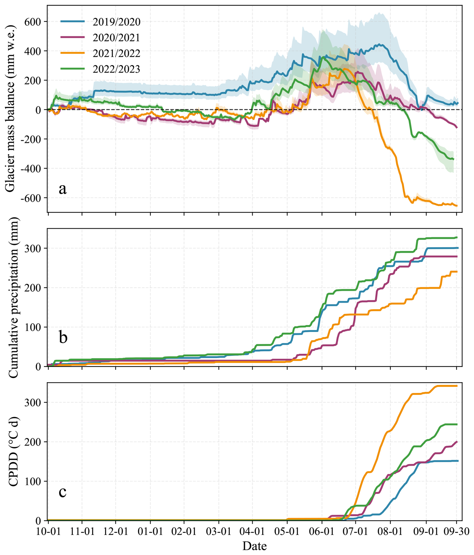 Figure 5Cumulative glacier-wide mass balance of the Kangxiwa Glacier during the 2019/2020–2022/2023 hydrological years with the uncertainties by shaded area (a). The cumulated precipitation (b) and the cumulated positive degree day recorded by the AWS4900 (c).