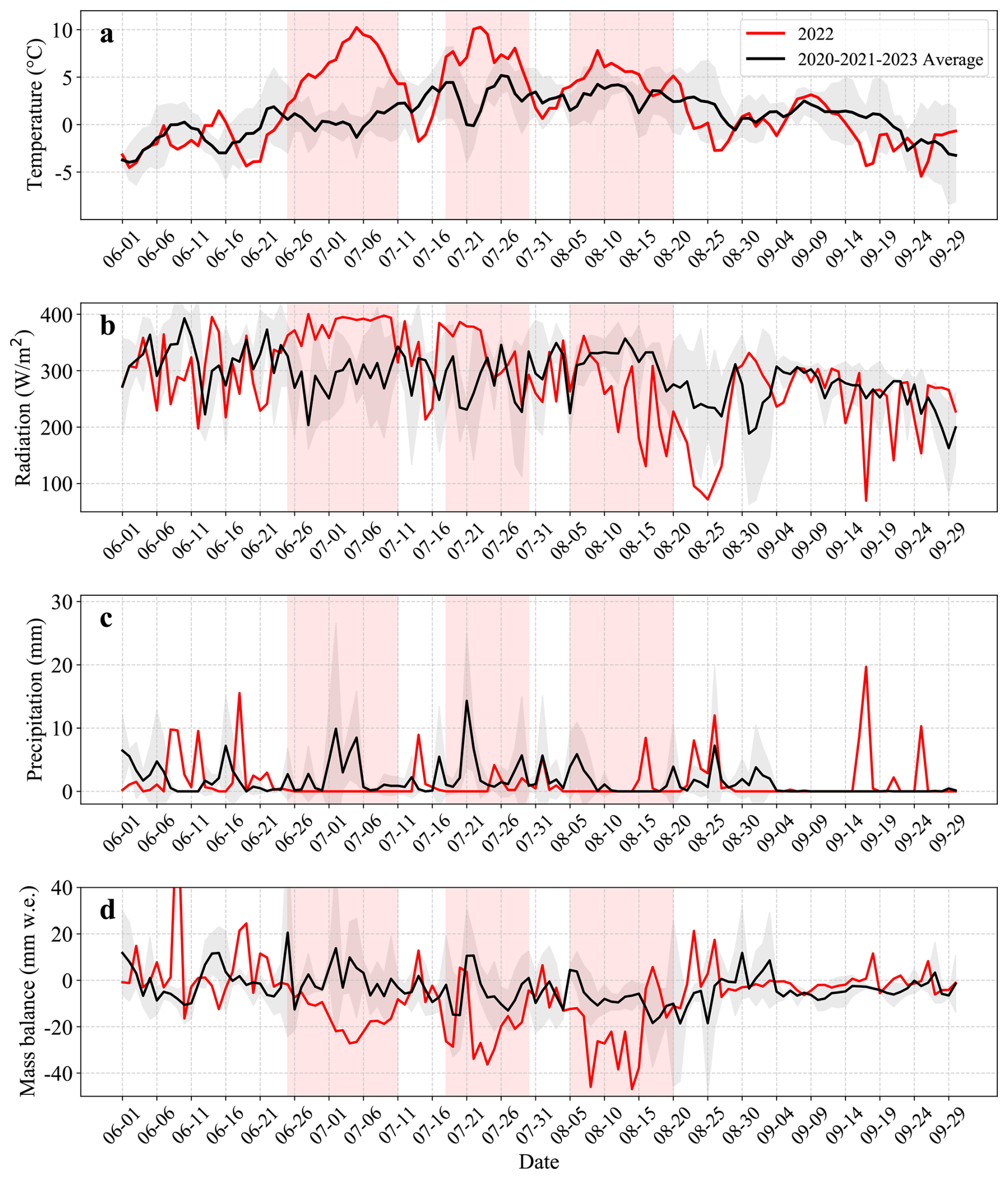 Figure 7Comparison of daily air temperature (a), daily incoming shortwave radiation (b), daily precipitation (c) and daily glacier-wide mass balance (d) at the Kangxiwa Glacier during the ablation season (June–September), showing the difference between 2022 and the other three years. The grey line shows the average for 2020, 2021 and 2023 with standardized variation (grey shaded area), while the red line shows the records for 2022. Light red rectangles highlight three heatwave events. The meteorological data was derived from the AWS4900.