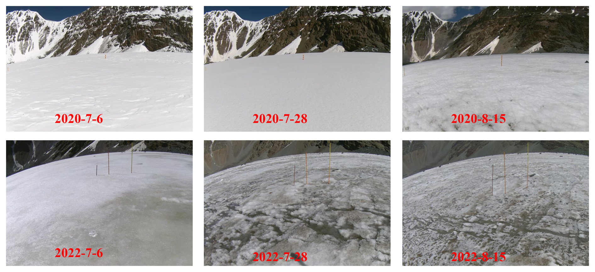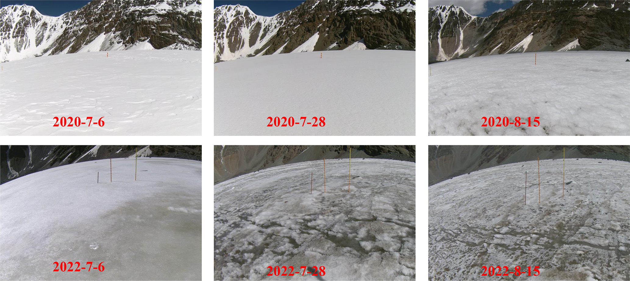 Figure 8Contrasting glacier surface conditions at the elevation of 5005 m between July–August 2020 and 2022.