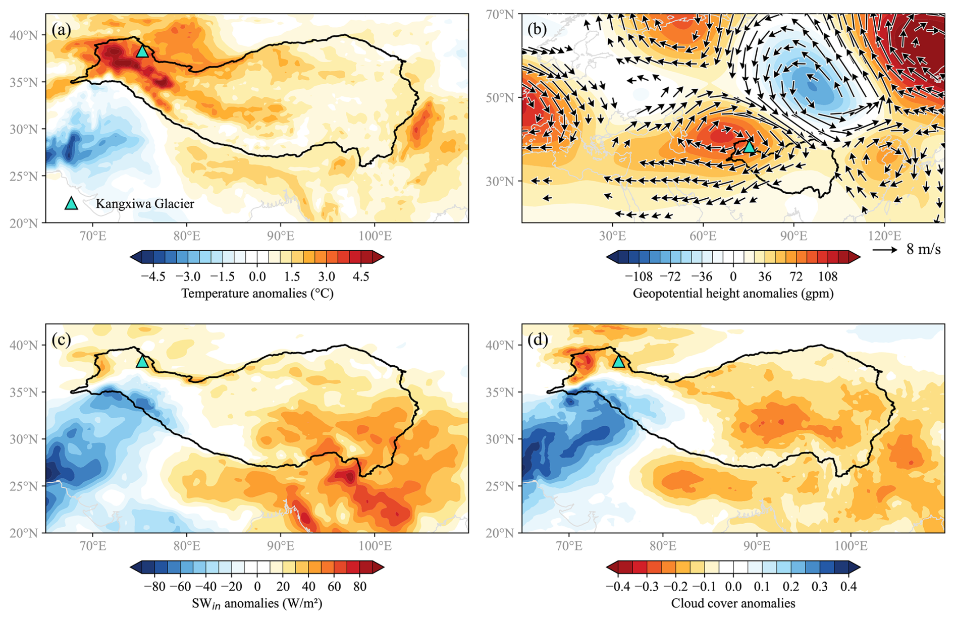 We analysed anomalies in temperature, solar radiation, cloud cover, geopotential height and wind fields at 200 hPa during July 2022, compared to the climatological average from 1991 to 2020, to investigate the anomalous large-scale atmospheric circulations linked to the 2022 July mass balance anomaly in this study area. Anomalously high temperatures of over 4 °C were observed across the Pamir Plateau and the western Kunlun Mountains. This suggests that other glaciers in the region may also have experienced significant mass loss during the summer of 2022. Latest research in the Northwestern Pamirs found that enhanced glacier mass loss was linked to the 2022 July heatwave (Jouberton et al., 2025). Numerous studies have linked heatwaves and high-temperature events to anticyclonic systems (Deng et al., 2023; Jiang et al., 2023; Song et al., 2024). Figure 9b shows that an upper-level anticyclonic anomaly developed over the northwestern flank of the Tibetan Plateau at 200 hPa. Under these circulation patterns, strong easterly wind anomalies occur on the southern side of the anticyclonic anomaly, reducing the westerly wind at 30–40° N. A decrease in westerly winds means less atmospheric water is delivered to the Pamir, resulting in reduced precipitation and cloud cover. Abnormal anticyclonic circulation can suppress convection and cause strong subsidence, resulting in reduced cloud cover (Fig. 9d). The decrease in cloud cover, in turn, leads to increased incoming shortwave radiation. Figure 9c indicates anomalously high shortwave radiation during the July 2022 heatwave events. For example, AWS4900 records showed that shortwave incoming radiation exceeded the average for 2020–2021–2023 by 90.6 W m−2 (+31 %) and 48.7 W m−2 (+17 %) during the two heatwave events. This enhanced solar radiation further amplified the heatwave. This enhanced solar radiation further intensified the heatwaves. Overall, anticyclonic circulation anomalies contributed to air descent and anomalous diabatic heating, resulting in sunny and dry weather in eastern Pamir in July 2022 (Fig. 5). This favoured an increase in shortwave radiation to heat the land, which can increase outgoing longwave radiation and turbulent heat fluxes from the land surface to the atmosphere, causing higher air temperatures.