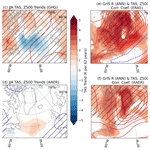 AAER, on the other hand, contributes almost nothing to this long-term trend pattern (Fig. 5a vs. d). These trend maps imply that the detected signal from AAER during 1958–2019 (Fig. 3b, f) does not arise through the long-term linear trend but through forced decadal variability undergoing phase changes during this time period. We compare maps of the correlation from ERA5 (Fig. 5e) and from the ensemble mean of AAER during 1958–2019 (Fig. 5f). The AAER-based correlation map shows a pattern that is distinct from its long-term trend (Fig. 5f vs. d); instead, the correlation map shows a pattern more similar to the ERA5-based correlation map (Fig. 5e vs. f). Both ERA5 and AAER have positive correlations between GrIS runoff and near-surface temperature and Z500. Figure 5f confirms a similar correlation pattern due to AAER, supporting an AAER-forced change in the variability of circulation, imprinted onto a pattern that reinforces Greenland blocking, consistent with Maddison et al. (2024).
