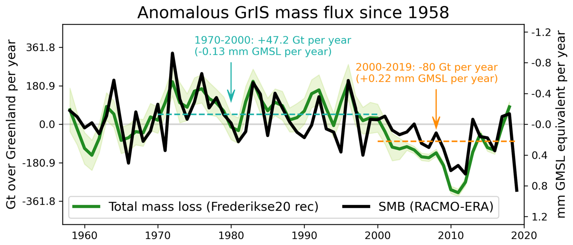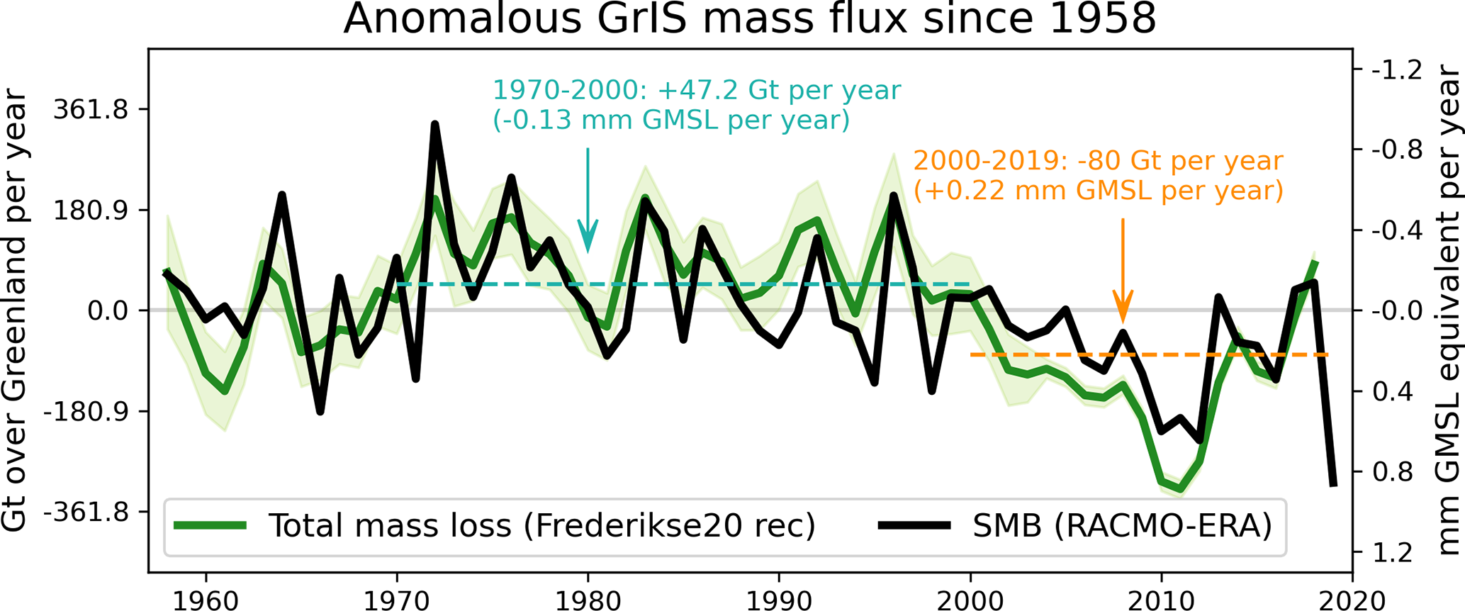 Figure 1Decadal variability in GrIS' contribution to Global Mean Sea Level (GMSL) is observable and explained by decadal variability in surface mass balance (SMB). The anomalous (long-term mean subtracted) annual GrIS mass loss from the Frederikse et al. (2020a) reconstruction (green) and the anomalous annual GrIS SMB simulated by RACMO with ERA5 reanalysis (RACMO-ERA; black). The thick green lines are the 5000-member ensemble mean values of the Frederikse et al. (2020a) reconstruction, and the shadings are ±1 standard deviation across the 5000 ensemble members.