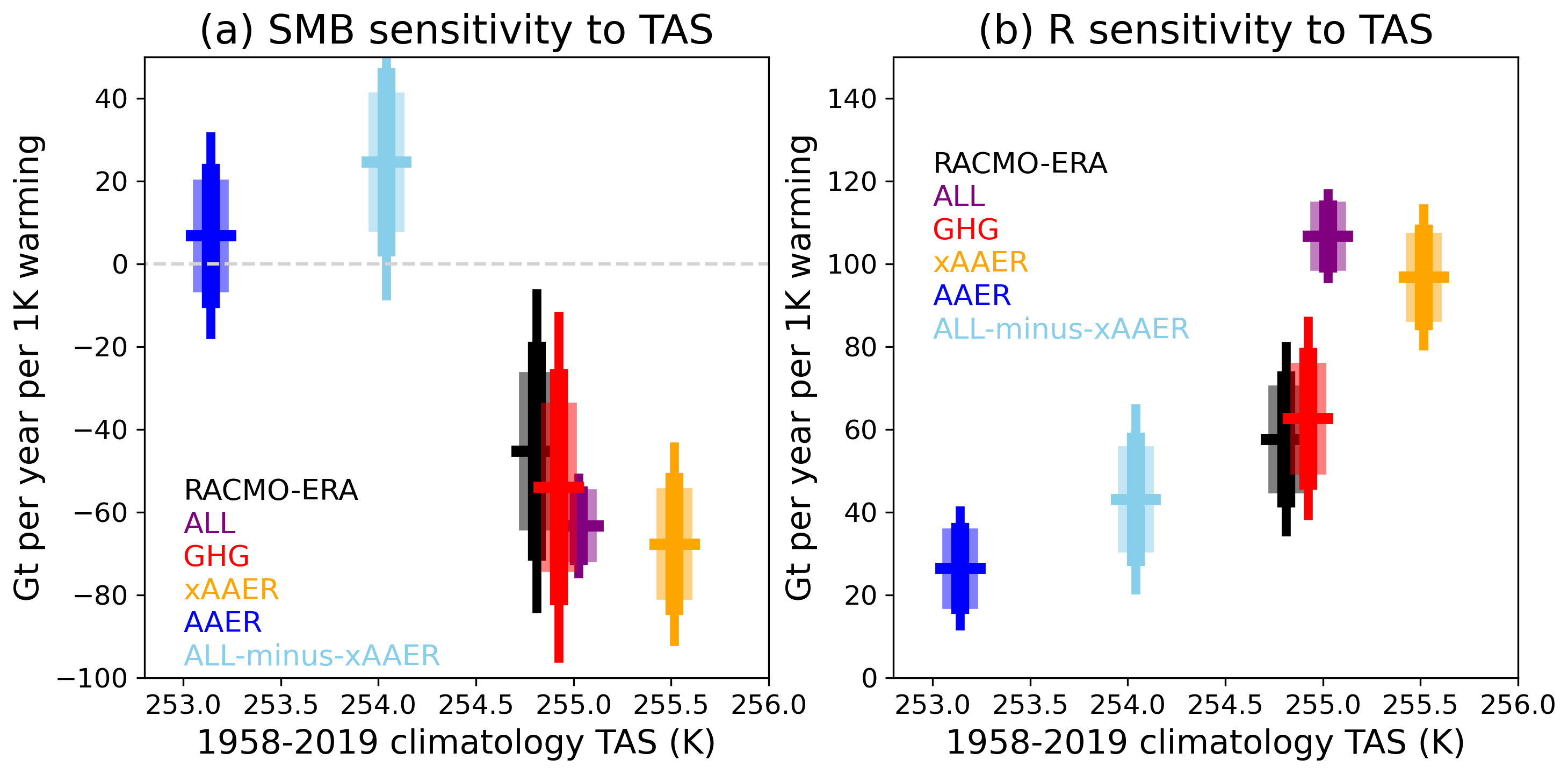 Figure 4(a) The observed (RACMO-ERA; black) and forced (ALL, GHG, xAAER, AAER, ALL-minus-xAAER; purple, red, orange, blue, light blue respectively) GrIS SMB sensitivity to near-surface temperature during 1958–2019 sorted by the climatological mean near-surface temperature. (b) The observed (RACMO-ERA; black) and forced GrIS R sensitivity to near-surface temperature during 1958–2019 sorted by the climatological mean near-surface temperature. Here, SMB and R sensitivities are derived by the Bayesian Total Least Square regression with SMB or R as y and TAS as x from RACMO, the ensemble mean of CESM2-LE, or the ensemble mean of CESM2-SFLE as appropriate.
