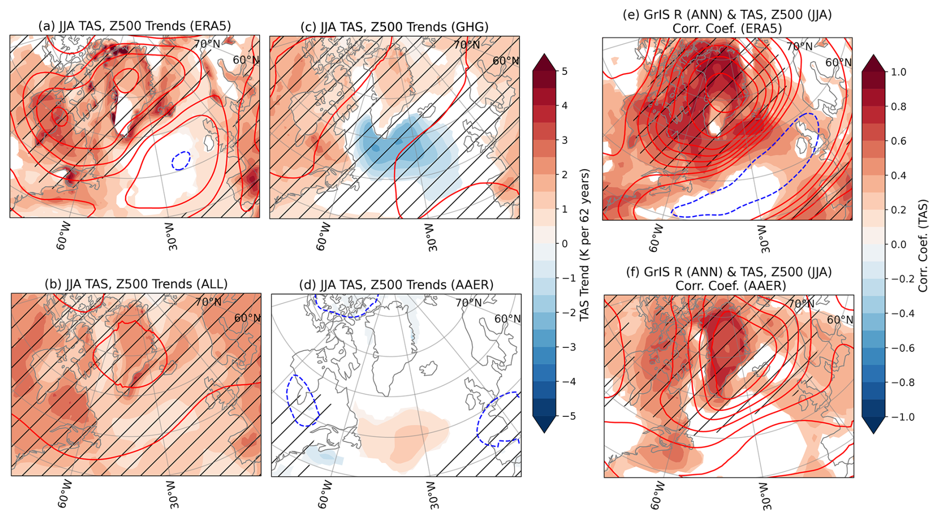 Figure 5Trend maps of 500 hPa geopotential height (Z500; contours) and near-surface air temperature (TAS; shading) during 1958–2019 in (a) ERA5 reanalysis, (b) ensemble mean of all forcings CESM2-LE simulations (50; ALL), (c) ensemble mean of GHG-only simulations (15; GHG), and (d) ensemble mean of AAER-only simulations (15; AAER). Grid cells with insignificant TAS trends are masked out (95 % confidence for ERA5, and ensemble mean trend over 1 standard deviation across all trends in the ensemble for climate model simulations). Grid cells with significant Z500 trends are hatched (95 % confidence for ERA5 and ensemble mean trend over 1 standard deviation across all possible trends in the ensemble for climate model simulations). Z500 contours start from ±10 (m per 62 years) with contour spacing of 10 (m per 62 years). (e–f) Correlation map of GrIS R with Z500 (contours) and TAS (shading) during 1958–2019 in (e) ERA5 reanalysis and (f) 15-member mean AAER. Insignificant TAS correlations are masked out and significant Z500 correlations are hatched (95 % confidence). Contours start from 0.1 with contour spacing of 0.1. The significance level of the correlation coefficients is based on a t-test with the degrees of freedom corresponding to the length of data (1958–2019, 62 years).
