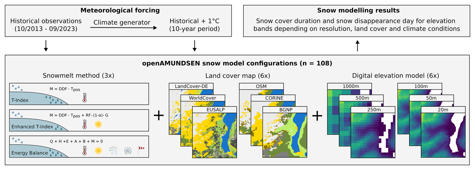 Our study contributes to the broader research objective of quantifying snow model uncertainty and follows up on the investigations by Essery and Etchevers (2004), Essery et al. (2013), and Günther et al. (2019, 2020) who assessed uncertainties in snow model results arising from snow model complexity, parameter errors and errors in the forcing data. The effect of process representations on the results are also presented in Magnusson et al. (2015). Particular consideration of snow in forested area was given in the second phase of the Snow Model Intercomparison Project (SnowMIP2) where output from 33 different models was compared (Essery et al., 2009). These studies highlight that the accuracy of the forcing data is more critical than parameter selection, while the type of the model seems of less importance. In addition, human errors are an important aspect affecting snow model performance (Menard et al., 2021). Our snow modelling experiments complement existing research by defining a large set of configurations for distributed snow model simulations in complex mountain terrain with open and forested areas, resulting in a large number of openAMUNDSEN model configurations (n=108) with both degree-day and physically based snowmelt simulations, varying land cover maps and different spatial resolutions. The assessment of results under a 1 °C warming allows for a quantification of snow model uncertainty relative to a potential warming signal.