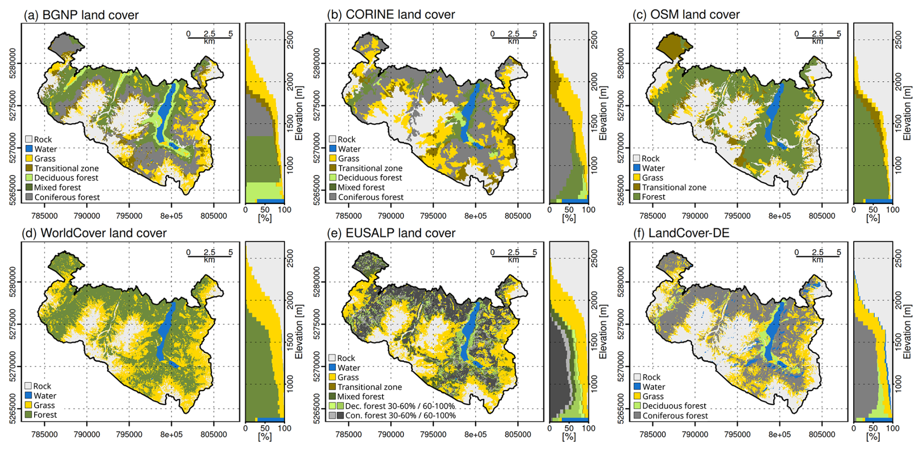 Figure 2Land cover maps for the BGNP based on the National Park habitat map (a; BGNP), CORINE land cover data (b; CORINE), OpenStreetMap data (c; OSM; https://www.openstreetmap.org/copyright, last access: 14 April 2026), ESA WorldCover data (d; WorldCover), the land use/land cover map for the European Alps developed by Marsoner et al. (2023) (e; EUSALP) and the Land Cover DE data from the German Aerospace Center (DLR) (f; LandCover-DE). The percentage coverage of each land cover class within 50 m elevation bands is shown right of each map.