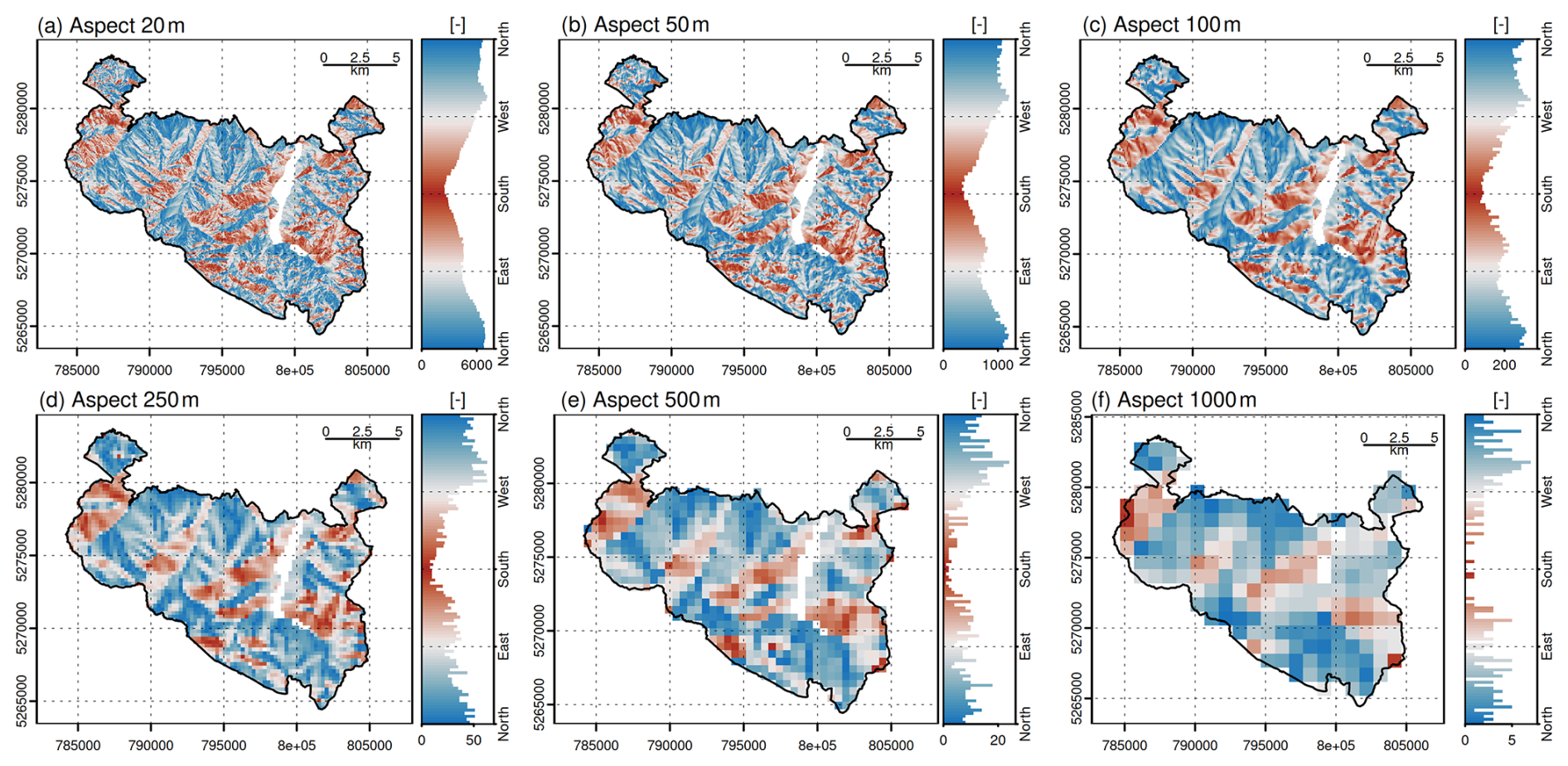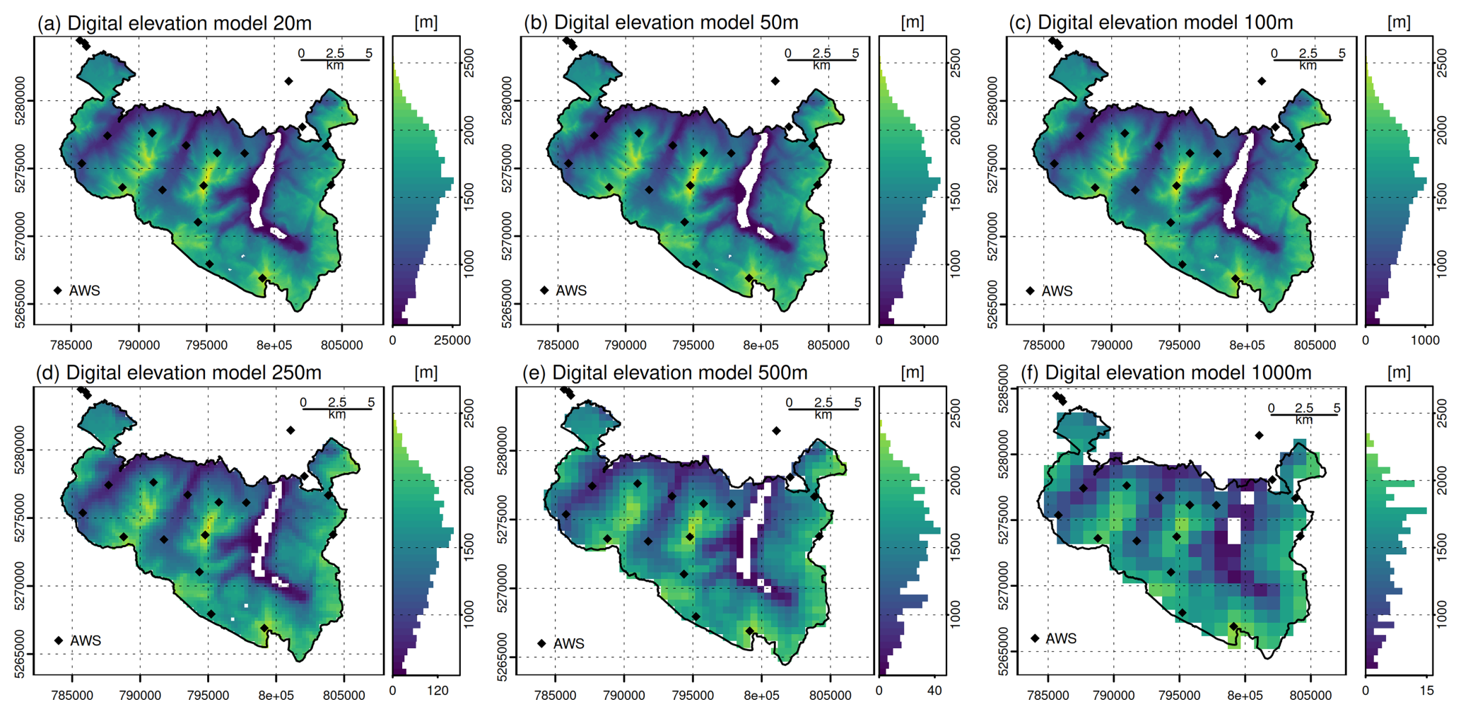 We identified the BGNP as an ideal study site for our snow modelling experiment. The BGNP covers an area of 208 km2 and is located in the state of Bavaria (Germany) in the North-East of the European Alps. It is the only German national park in the Alps and is characterized by a complex mountain landscape with an extreme topography covering elevations between 603–2713 m a.s.l. (meter above sea level) (Figs. 2 and 3). The open areas with bare rock and Alpine grassland in the higher elevations transition into coniferous, mixed and deciduous forest toward the lower elevations. Annual precipitation ranges from 1500 mm in the lower elevations to roughly 2600 mm in the peak regions, and the build-up and melt of a seasonal snow cover dominates the hydrology in the area (e.g. Strasser, 2008; Warscher et al., 2013; Storebakken et al., 2025). In cooperation with the Bavarian Avalanche Warning Service, the administration of the BGNP operates a dense network of automatic weather stations (AWSs) in the area. A detailed description of the station network including station names, locations, measured variables, example time series, and a description of the pre-processing of the AWS data is presented in Storebakken et al. (2025). The BGNP administration also provides a digital elevation model (DEM) in 10 m resolution, which we resample to resolutions between 20 and 1000 m (Fig. 3), and the BGNP habitat map (Fig. 2a). This habitat map was reclassified to seven classes, the three forest classes being the most important because forest types govern snow-canopy interactions and thus the entire seasonal dynamics of the snow cover in the forested areas. In addition to the BGNP land cover map, we process five other land cover maps for the area, all based on freely available and widely used datasets (Fig. 2b–f). Our aim is to capture the uncertainty that can be introduced into the distributed snow modelling with the selection of the land cover map. For comparability, we re-classify the data to similar land cover types. With regard to the forest representation, some data sources only have one forest class, whereas others distinguish different forest types and densities (Fig. 2). The land cover maps that we processed are based on the following data: (i) CORINE Land Cover 2018 obtained from the European Union's Copernicus Land Monitoring Service (https://doi.org/10.2909/960998c1-1870-4e82-8051-6485205ebbac, last access: 8 July 2025), (ii) OpenStreetMap (OSM) (https://www.openstreetmap.org/, last access: 8 July 2025), which we download using the R package “osmdata” (https://github.com/ropensci/osmdata, last access: 8 July 2025) (Padgham et al., 2017), (iii) WorldCover from the European Space Agency (ESA) (https://esa-worldcover.org/, last access; 8 July 2025) (Zanaga et al., 2022), (iv) Land Use/Cover Map for the European Alps developed by Marsoner et al. (2023) and (v) Land Cover Germany from the German Aerospace Agency (DLR) described in Weigand et al. (2020) (https://doi.org/10.15489/1ccmlap3mn39, last access: 7 July 2025).