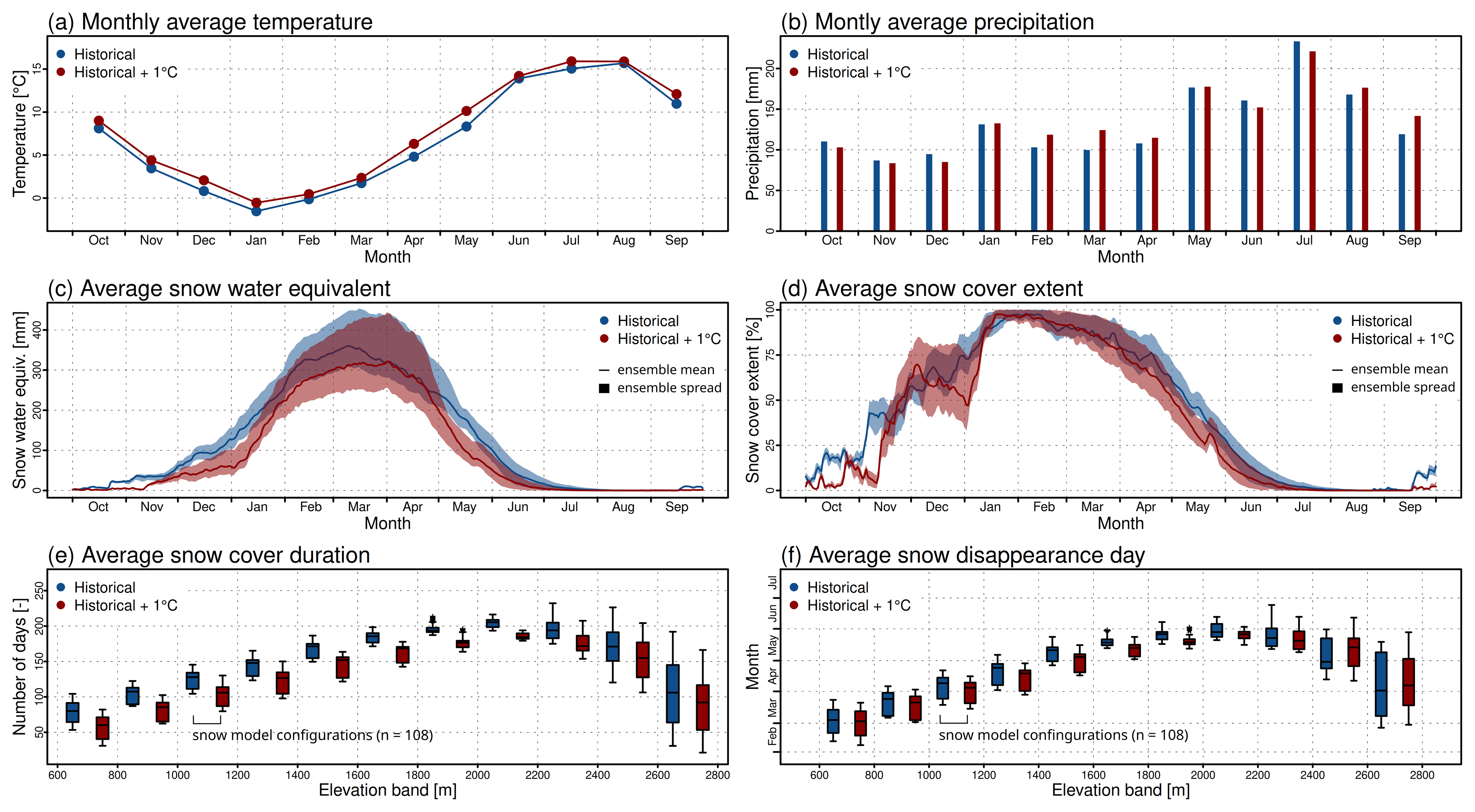 Figure 4Monthly average temperatures (a) and precipitation totals (b) for the BGNP based on historical observations (October 2013–September 2023) and a 10 year period characterized by a 1 °C warming generated using the openAMUNDSEN climate generator. The average seasonal cycle of simulated snow water equivalent (c) and snow cover extent (d) as well as the average snow cover duration (e) and snow disappearance day (f) for 200 m elevation bands is assessed for all openAMUNDSEN model configurations (i.e. 108 for historic and for 1 °C warming conditions).