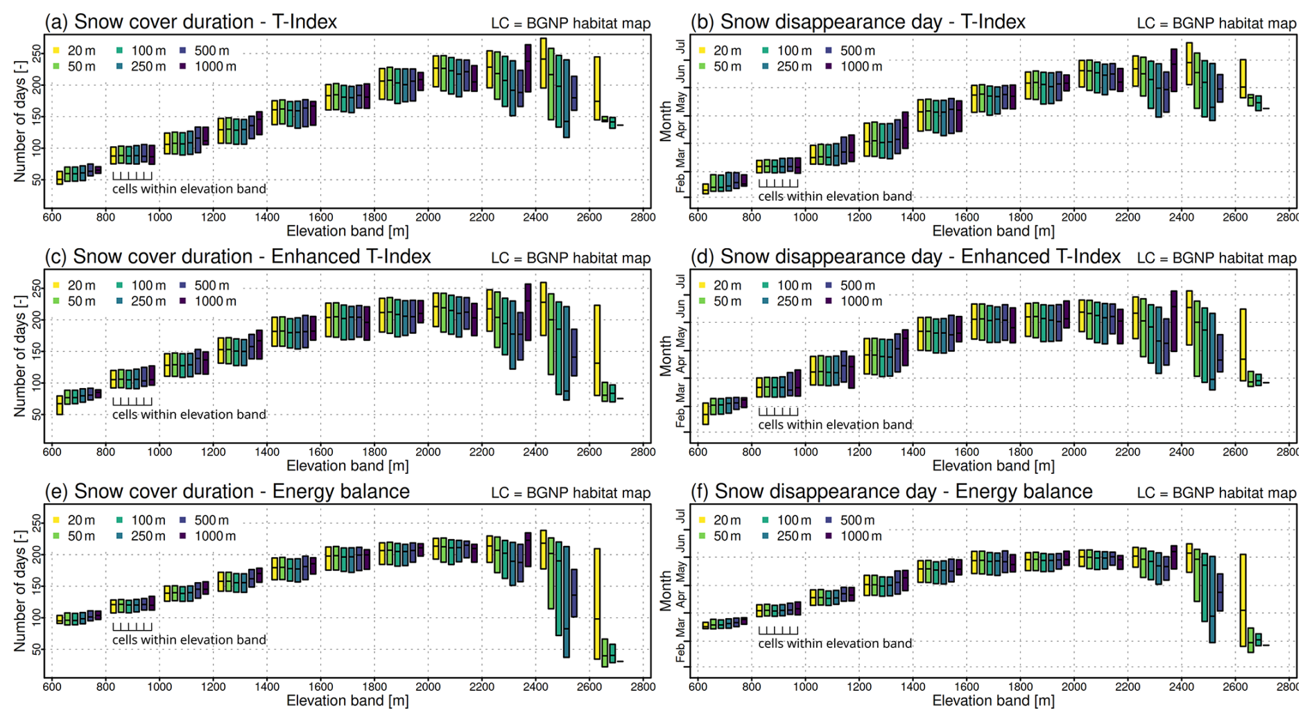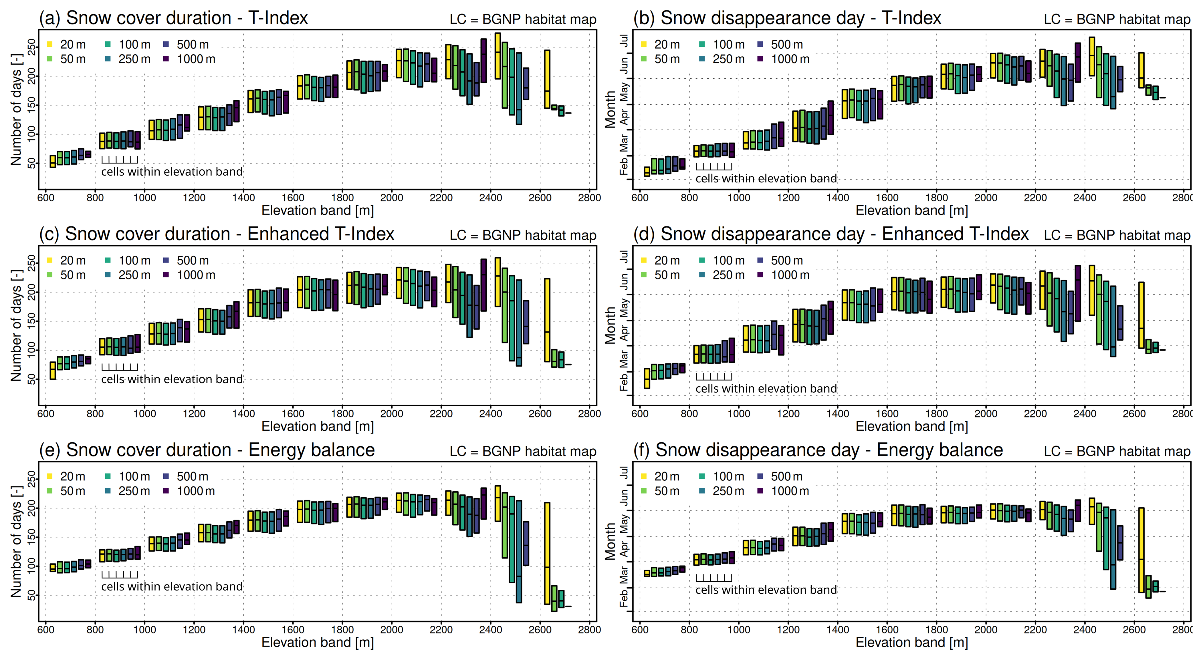 Figure 5Simulated snow cover durations and snow disappearance days in the BGNP for different grid resolutions using the land cover map derived from the BGNP habitat data and the T-Index (a, b), enhanced T-Index (c, d) and energy balance (e, f) approaches available in the openAMUNDSEN snow model. Results are aggregated by 200 m elevation bands. Boxplots are displayed without whiskers and outliers.