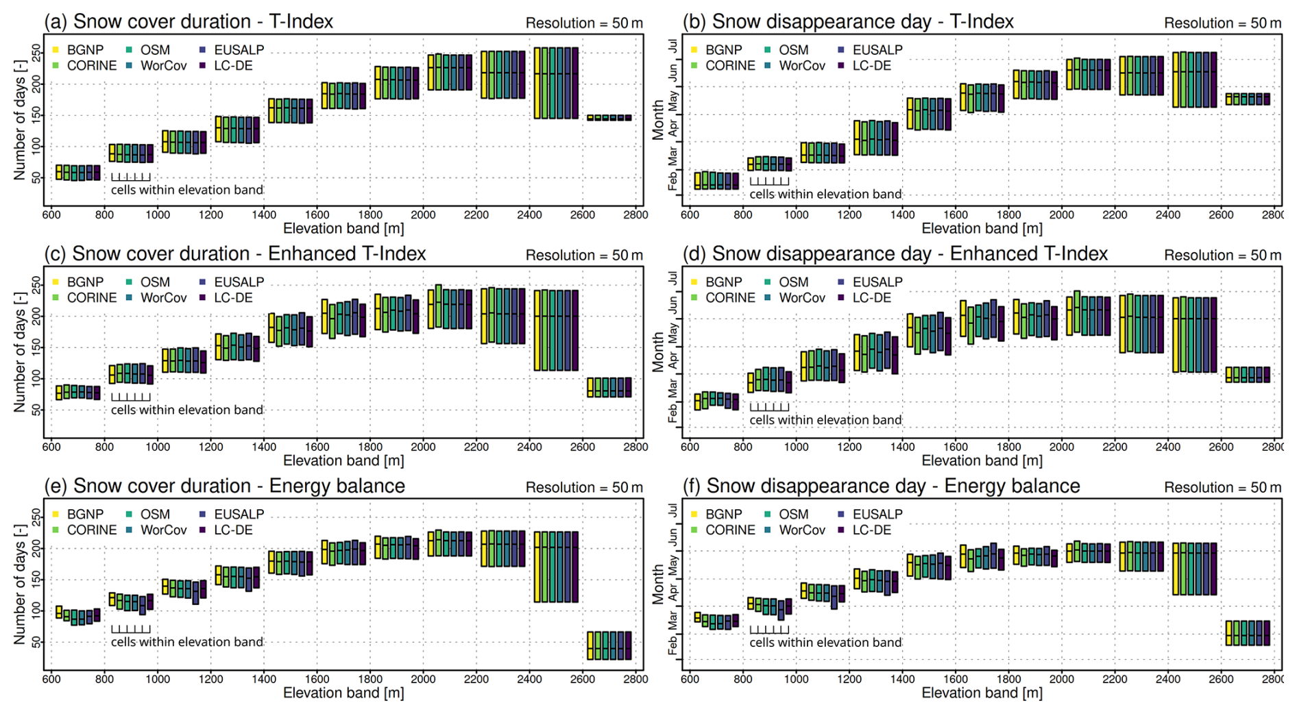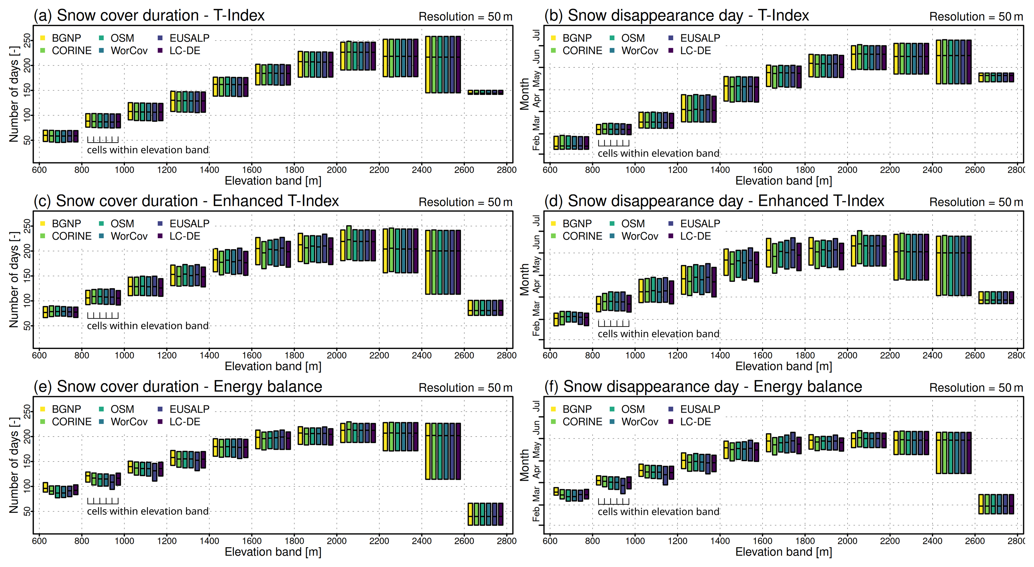 Figure 6Simulated snow cover durations and snow disappearance days in the BGNP for different land cover maps using a 50 m spatial grid resolution and the T-Index (a, b), enhanced T-Index (c, d) and energy balance (e, f) approach available in the openAMUNDSEN snow model. Results are aggregated by 200 m elevation bands. Boxplots are displayed without whiskers and outliers.