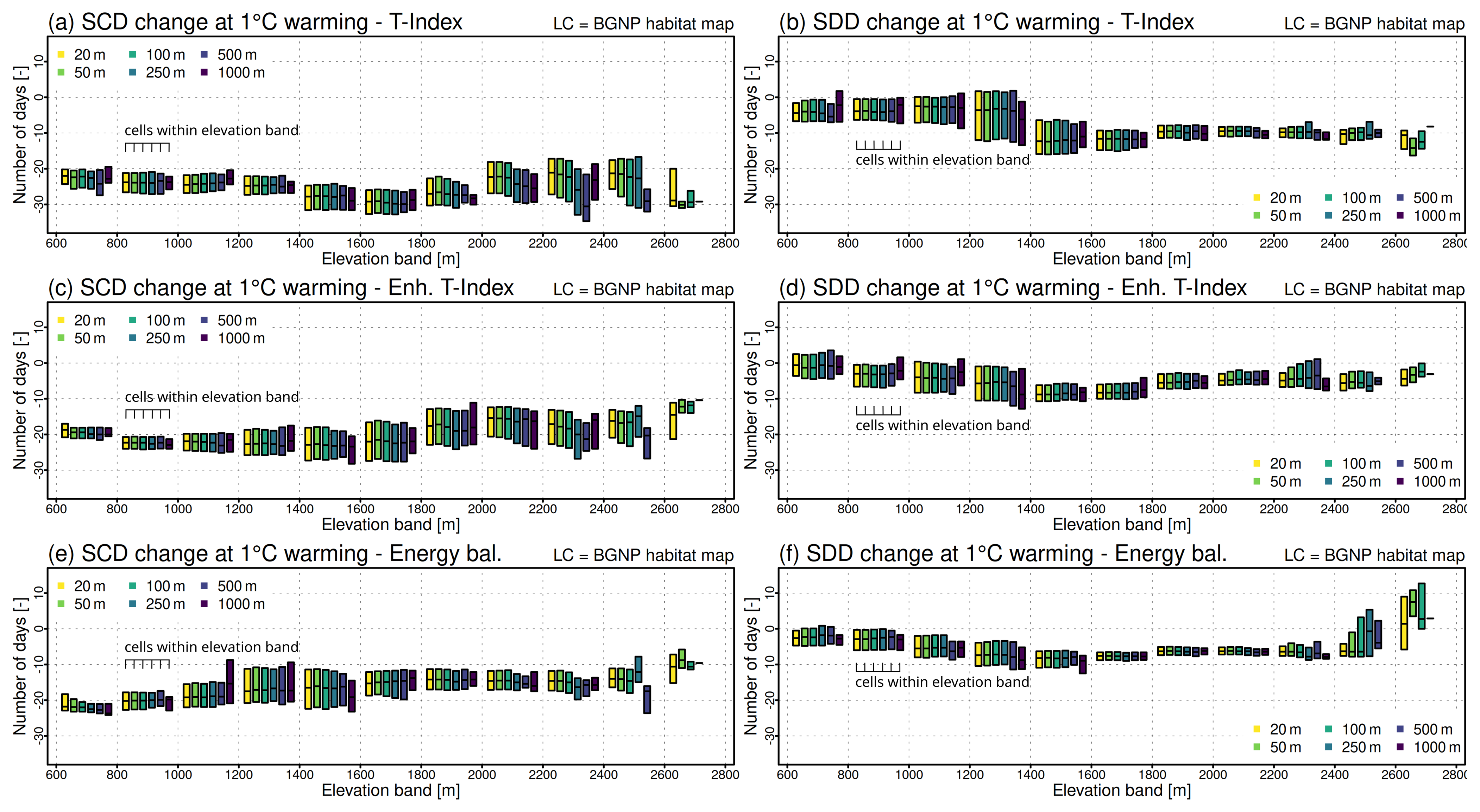 Our model experiments indicate that a 1 °C warming can cause a reduction in SCD of more than 20 d in the BGNP (Fig. 7a, c and f). With regard to SDD, the change signal in our model experiment is smaller with values of a few days up to ten days (Fig. 9b, d and f). The changes induced by higher temperatures and assessed for elevation bands seem consistent for spatial resolutions between 20–250 m. Deviations between model configuration using different spatial resolutions mainly show up at coarser modelling resolutions (i.e., 500 or 1000 m) and for elevations below 800 m and above 2200 m. Our results also indicate that the magnitude of the difference can vary strongly within an elevation band. The length of the boxes, which cover 50 % of the cells within the elevation band, can easily span across a range of 10 d (Fig. 7).