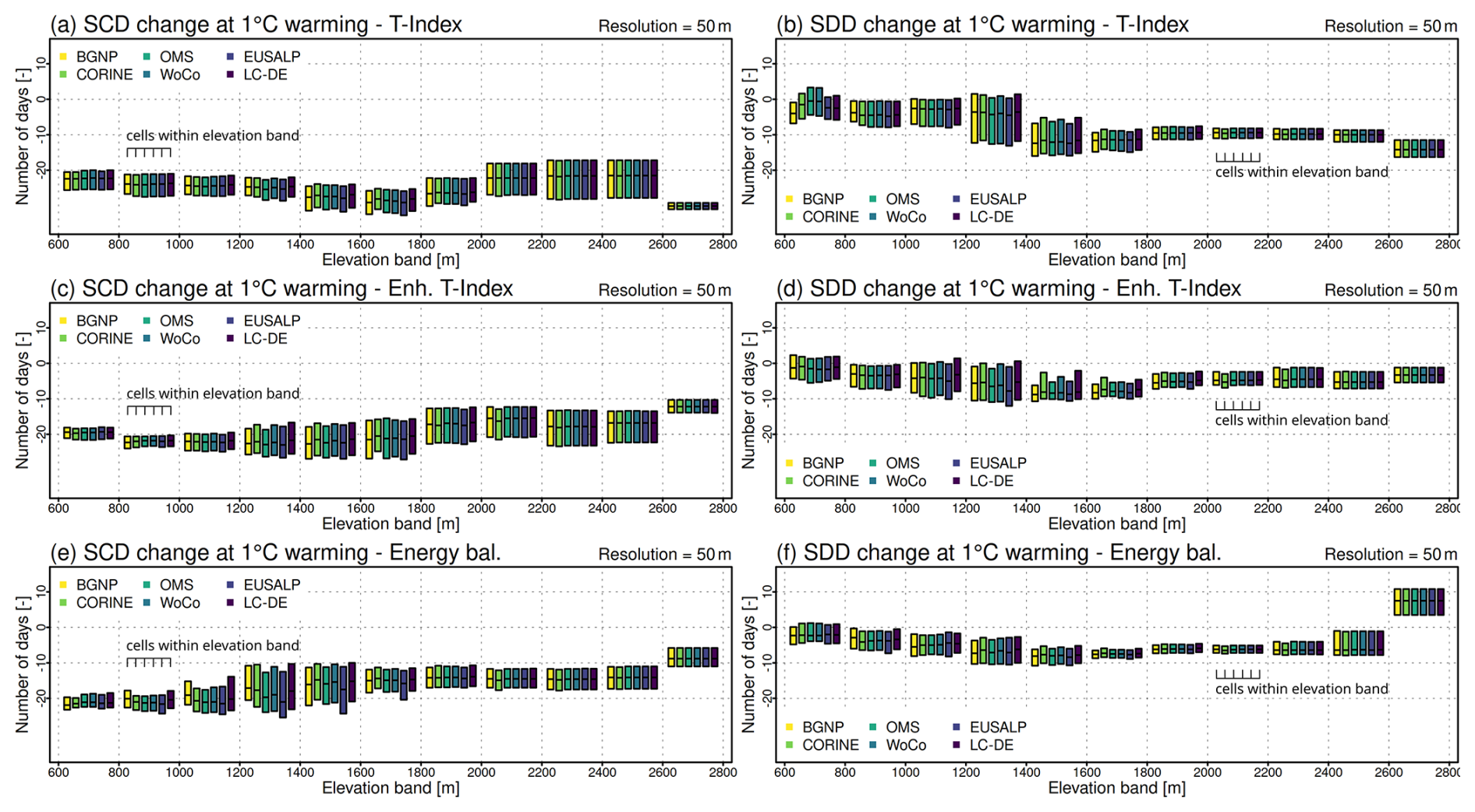 Figure 8Changes in simulated snow cover durations and snow disappearance days in the BGNP induced by a 1 °C warming for different different land cover maps using a 50 m spatial grid resolution and the T-index (a, b), enhanced T-index (c, d) and energy balance (e, f) approach available within the openAMUNDSEN snow model. Results are aggregated by 200 m elevation bands. Boxplots are displayed without whiskers and outliers.