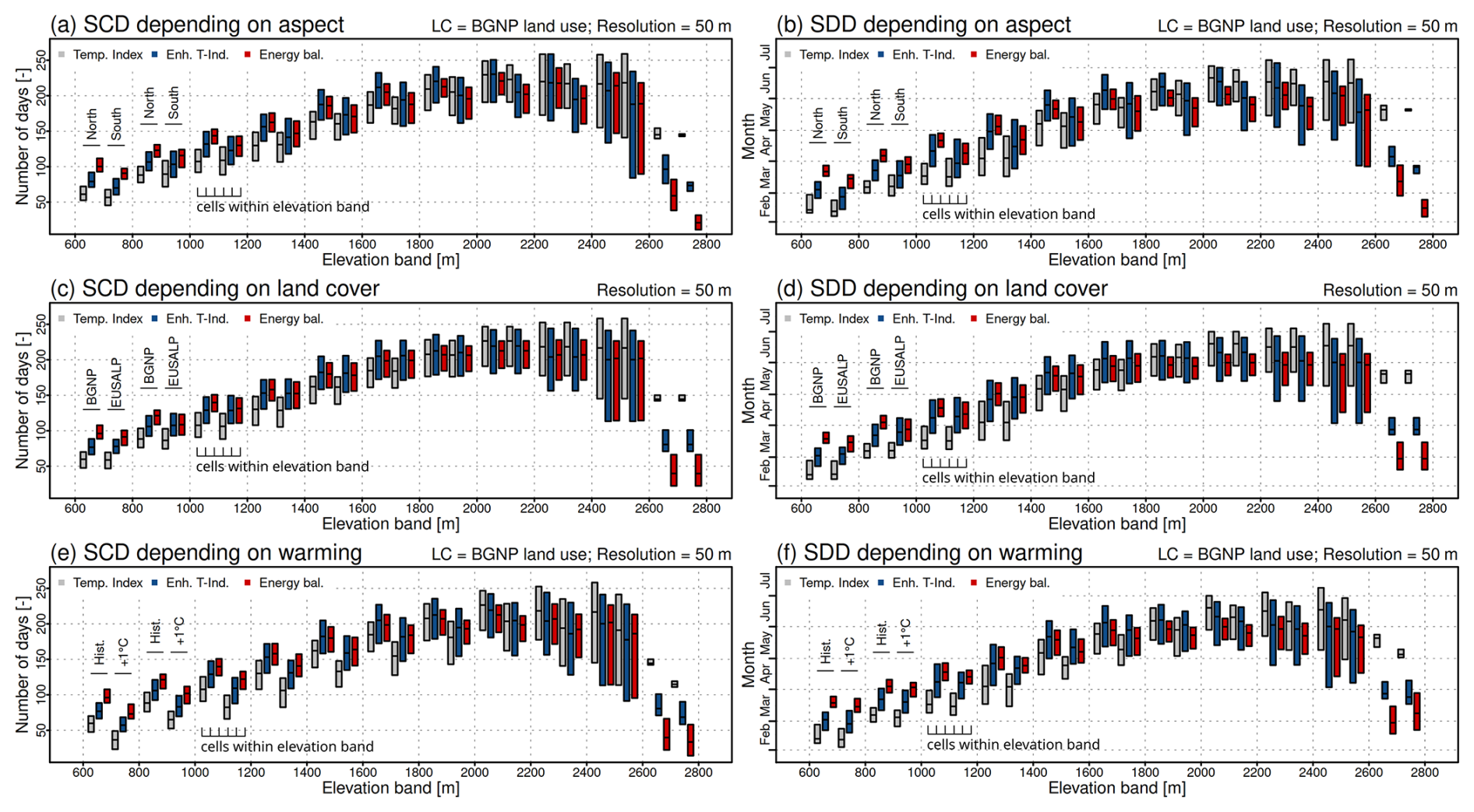Next, we directly compare results for SCDs and SDDs using different snowmelt simulation methods and assess results with respect to differences stemming from different aspect, land cover map and a 1 °C warming (Fig. 9). The aspects for the different model resolutions are presented in Appendix A (Fig. A2). Our results point out that the selection of the snowmelt modelling method can strongly influence SCD and SDD. Differences between the snowmelt modelling methods are most prominent below approx. 1600 m with simulations using the T-Index approach resulting in considerable shorter SCDs (Fig. 9a, c and e) and earlier SDDs (Fig. 9b, d and f). Energy balance based simulations, however, produce longer SCDs and later SDDs for this elevation zone, while results from the enhanced T-Index approach tend to be between those of the other two approaches. This signal reverses at high elevations (>2000 m) and the T-Index approach suggests longer SCDs and later SDDs than the other two snowmelt modelling approaches. Our modelling results indicate that at elevations below approx. 1600 m and above approx. 2200 m the differences induced by different snowmelt modelling approaches are stronger than the signal of change induced by a 1 °C warming (Fig. 9e and f). For elevation bands between 1600 and 2200 m, the results for SCDs and SDDs are more consistent and the change induced by a 1 °C warming exceeds the spread caused by different snowmelt simulation methods. Also the usage of different land cover maps can induce changes in SCDs and SDDs that can be within the same range as the change induced by a 1 °C warming (Fig. 9c and d), however, differences are less pronounced than differences resulting from the different snowmelt modelling methods, and are limited to elevations with differences in the forest representation in the land cover maps. While the enhanced T-Index and the energy balance approach can capture the differences in SCDs and SDDs depending on the exposition within elevation bands, the T-Index approach cannot account for such variabilities (Fig. 9a and b). Also the difference between northern and southern slopes is of the same magnitude as the signal induced by a 1 °C warming (Fig. 9).