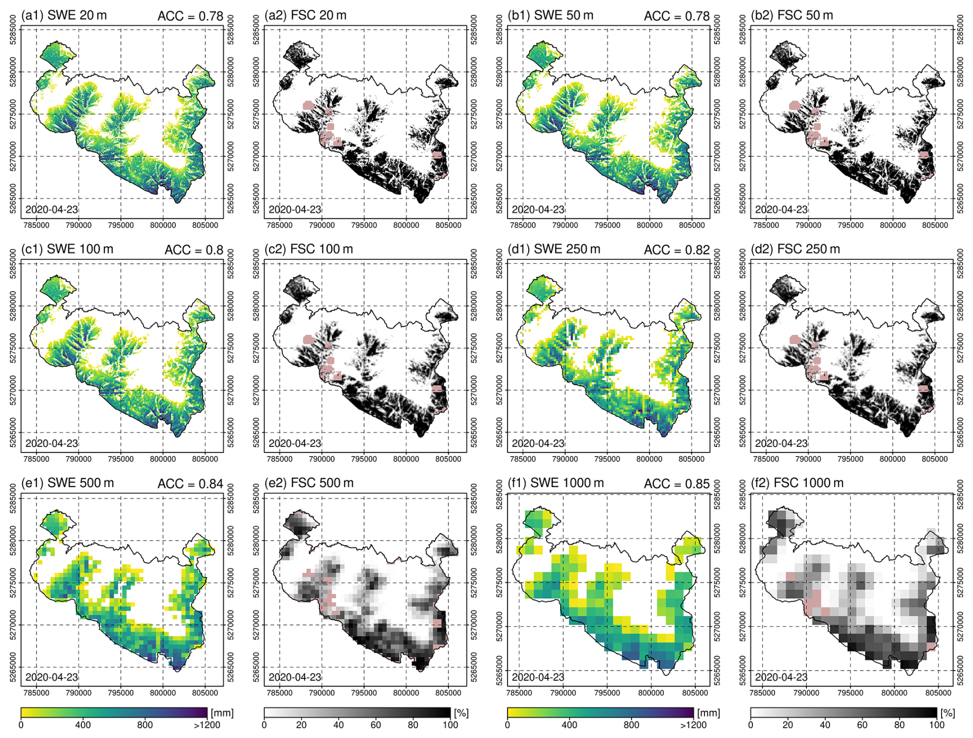Figure B1Simulated snow water equivalent (SWE) using the energy balance approach available in openAMUNDSEN and satellite-based fractional snow cover (FSC) maps derived from Sentinel-2 data for the BGNP on 23 April 2020 for different grid resolutions: 20 m (a), 50 m (b), 100 m (c), 250 m (d), 500 m (e) and 1000 m (f). The accuracy (ACC) assessed comparing the simulated SWE with the corresponding re-sampled satellite-based FSC observation is noted on the top-right of each SWE map.