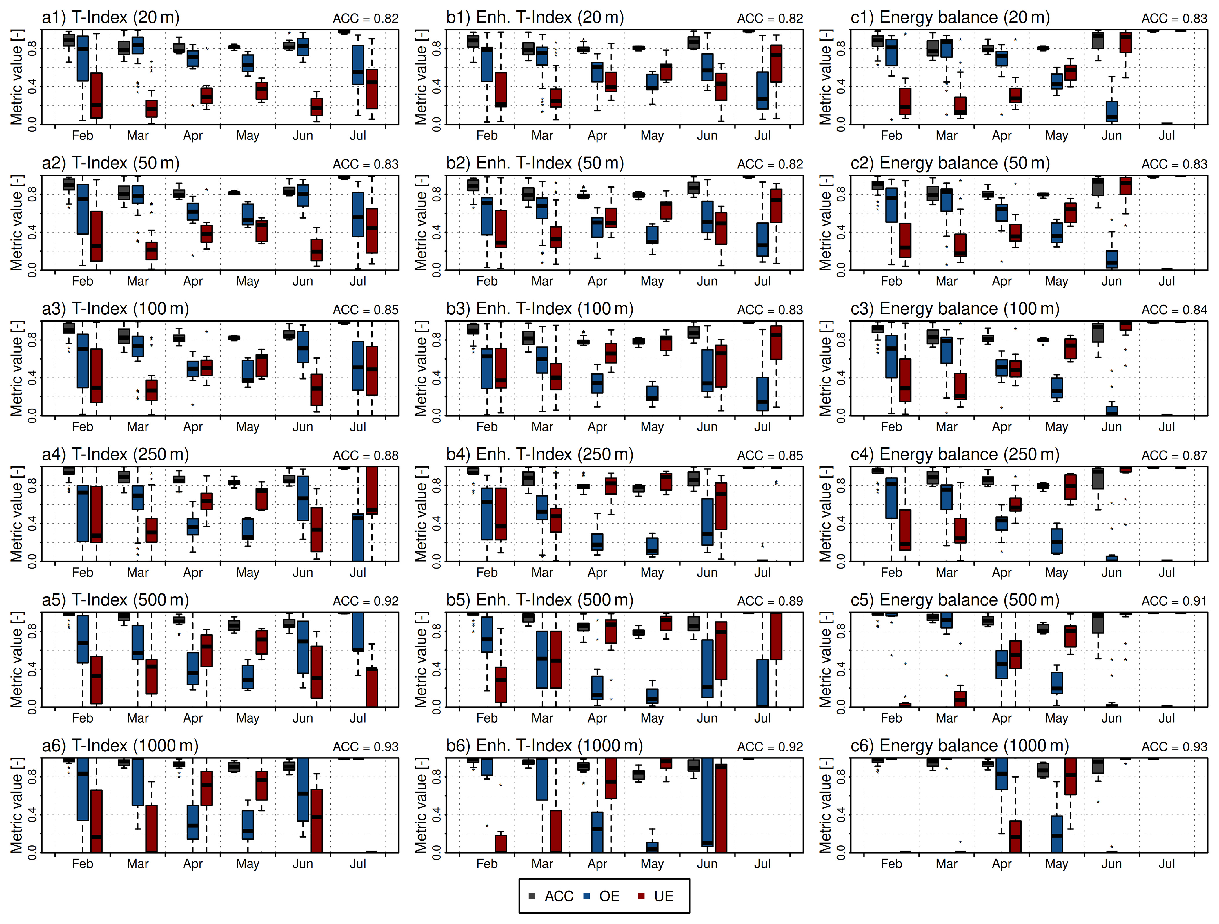 Figure B2Evaluation of openAMUNDSEN snow simulations in different spatial resolutions for non-forested areas in the BGNP between February and July using fractional snow cover (FSC) maps derived from Sentinel-2 data by means of accuracy (ACC), overestimation error (OE) and underestimation error (UE) for images with not more than 50 % cloud coverage. The average ACC for all scenes is noted on the top-right of the plot panels.