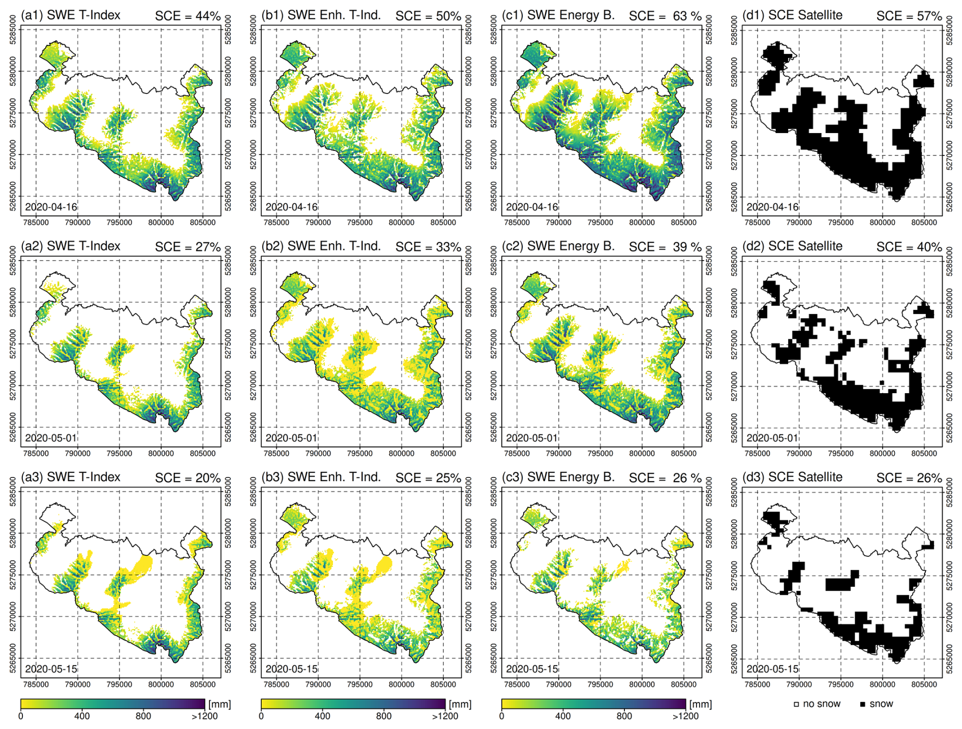 Figure B3Simulated snow water equivalent (SWE) using the T-Index (a), enhanced T-index (b) and energy balance (c) snowmelt simulation approaches available in the openAMUNDSEN snow model with a spatial resolution of 100 m and satellite-based snow cover extend maps (SCE) derived from MODIS snow cover data (d) for the BGNP and the three selected days: (1) 16 April 2020, (2) 1 May 2020 and (3) 15 April 2020. The total snow covered extent (SCE) is noted on the top-right of each map.
