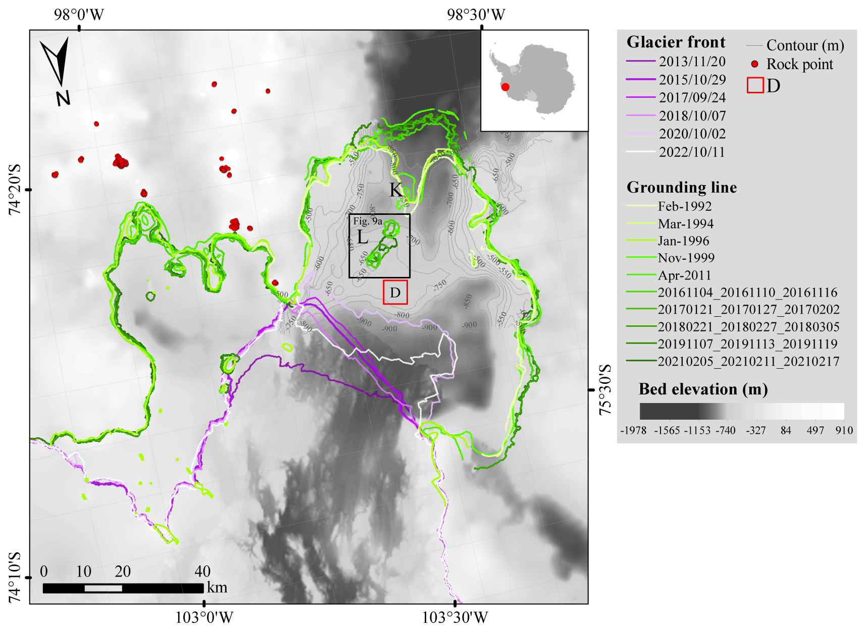 Figure 1Location and geometry of the PIIS. Ice front positions, grounding line locations, and 458 non-glaciated ground control points (red points). Bed elevation (50 m contour interval, labelled between −750 and −500 m) is from BedMachine v3 (Morlighem et al., 2020; Morlighem, 2022), showing the submarine ridge. Grounding lines are from MEaSUREs (Rignot et al., 2016) (from 1992–2011) and from DROT results (from 2016–2021). L and K mark ice rumples (Rignot et al., 2014). Ice front positions (2013–2022) are from Landsat imagery (Landsat-8/9) and Sentinel-1 SAR imagery via Google Earth Engine. Red block D denote the region for calculating mean double-differential vertical displacement. The black frame denotes the zoomed-in region in Fig. 9a.