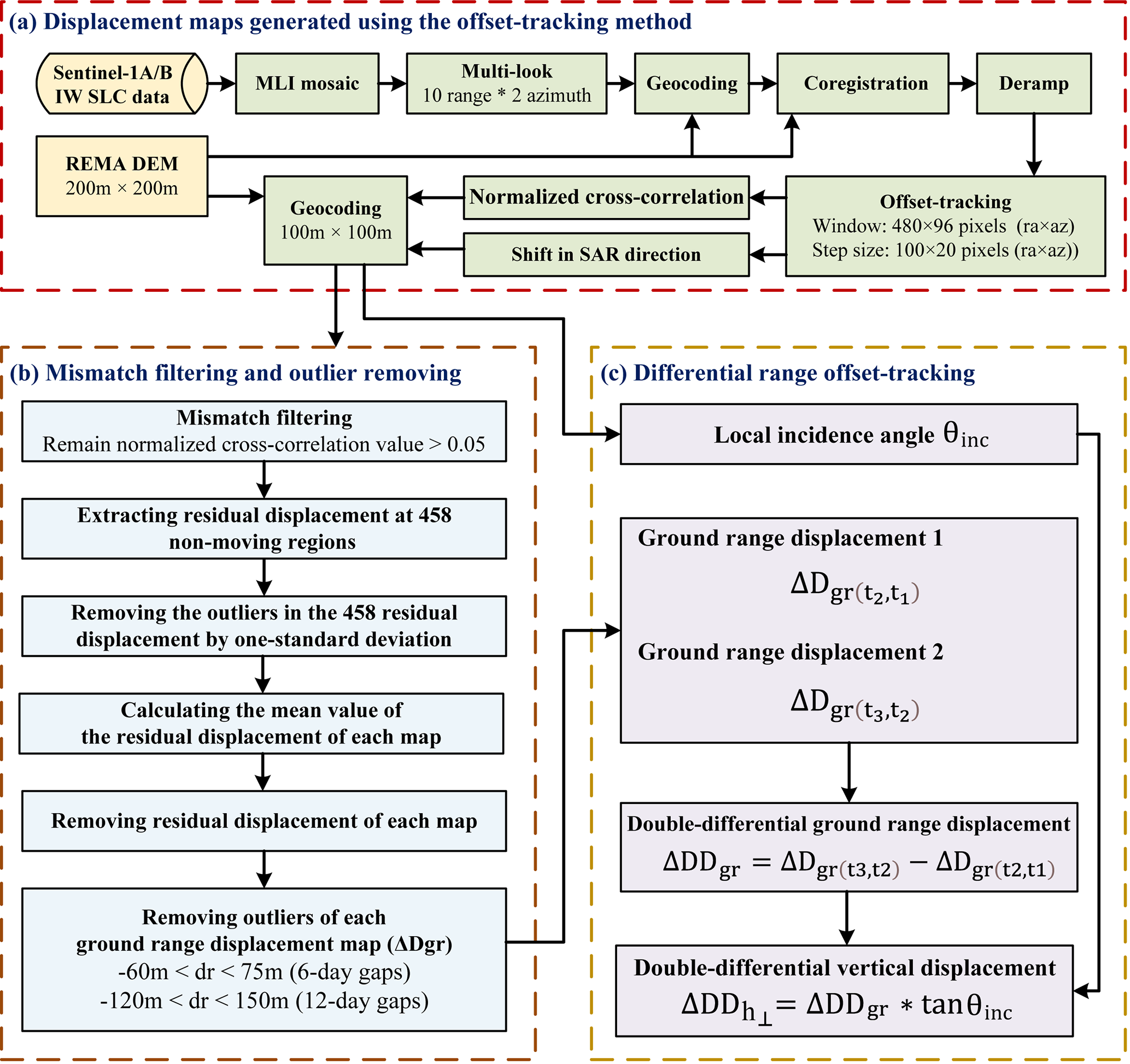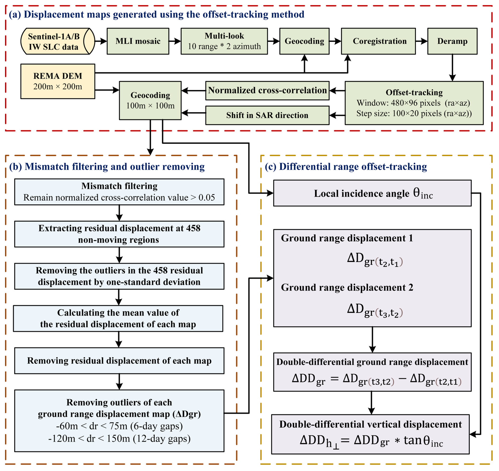 Assuming the horizontal displacement between two SAR image pairs that are closely spaced in time is very small, we can cancel the horizontal displacement and obtain the differential vertical bias in the ground range (ΔDDgr) by differencing two ground range displacement fields (Rignot, 1998; Joughin et al., 2010, 2016; Marsh et al., 2013; Christianson et al., 2016; Friedl et al., 2020):