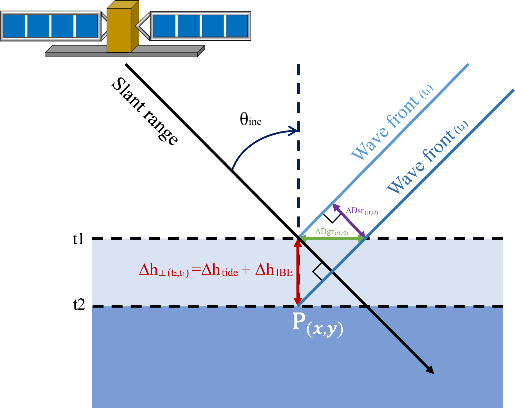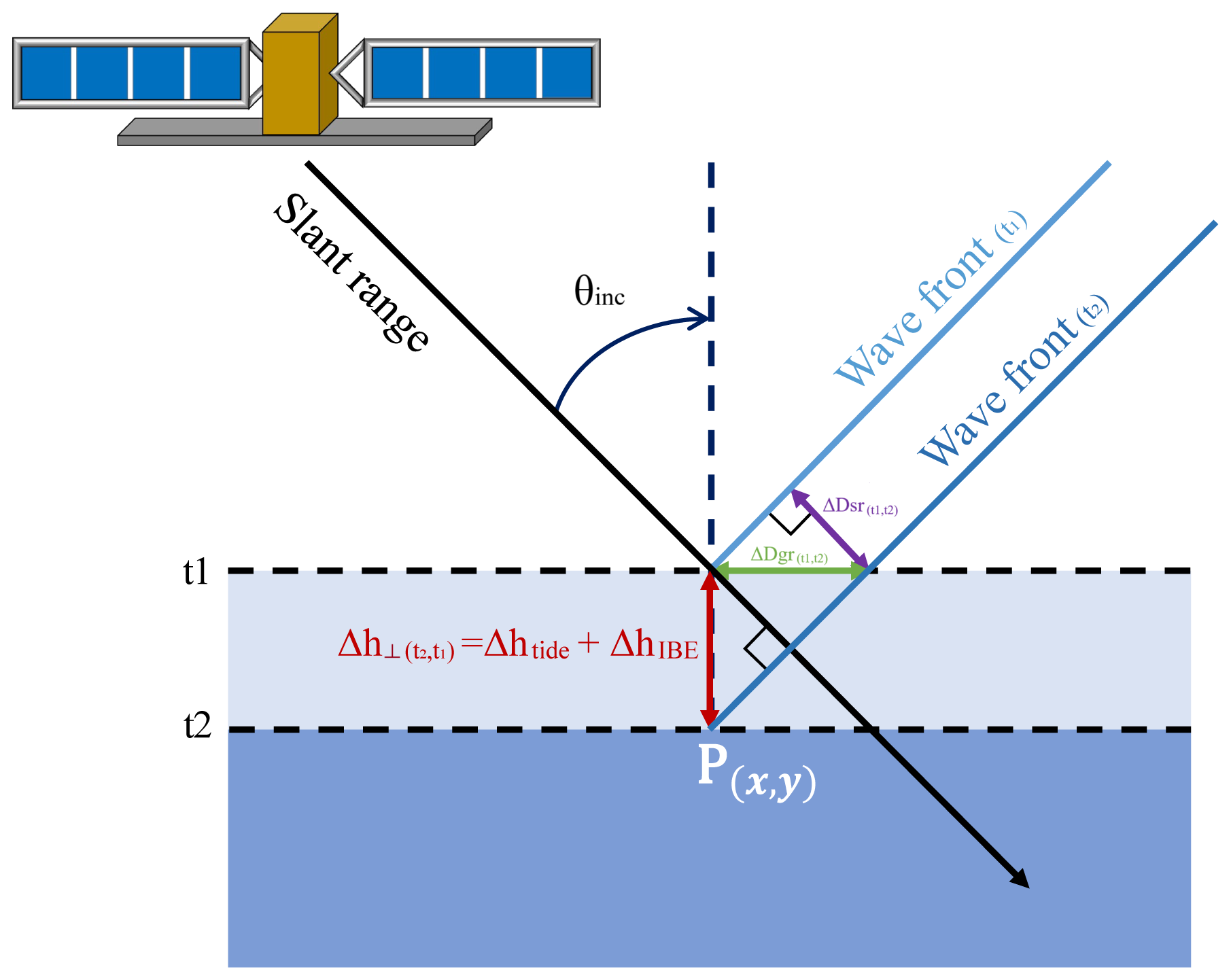Figure 3Side-looking spaceborne SAR imaging geometry. A vertical displacement of a Point P(x,y) from t1 to t2 is imaged at different slant range positions () depending on its elevation.
