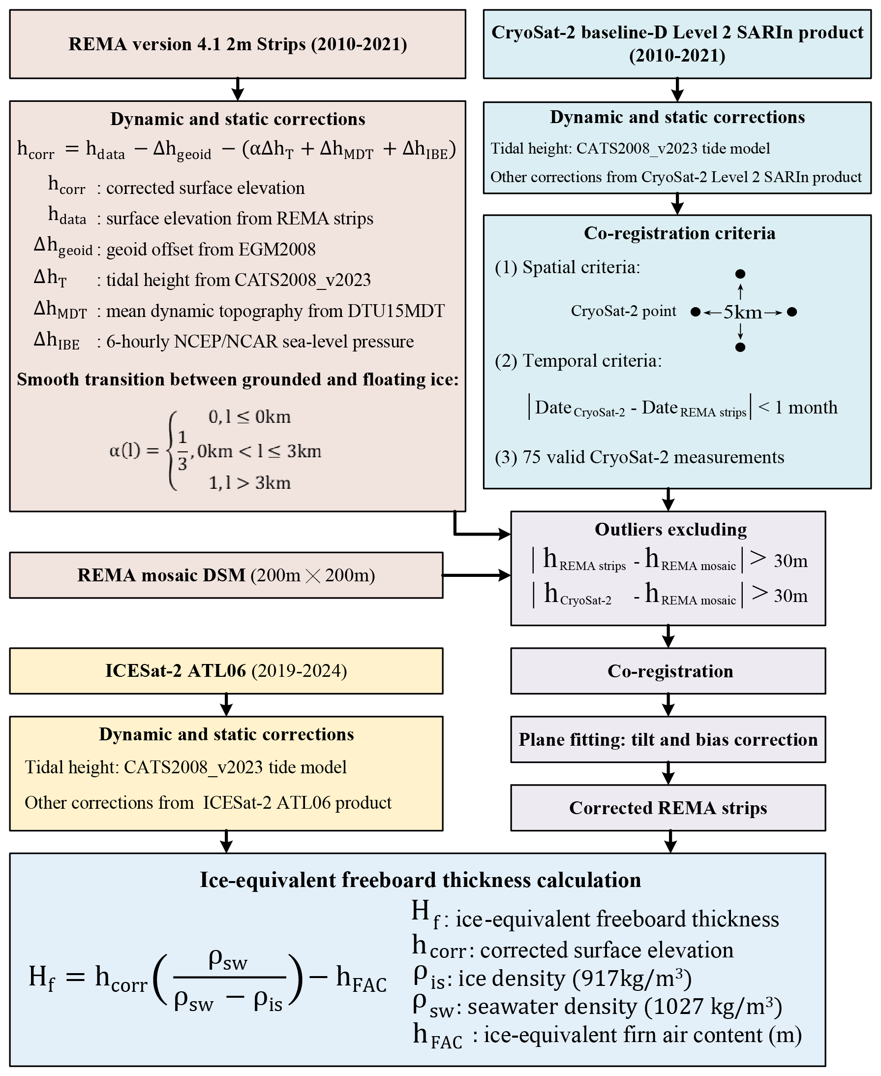 Co-registration of REMA strips to CryoSat-2 followed a modified procedure from Zinck et al. (2023), with the following criteria: (1) The longitudinal and latitudinal spacing between CryoSat-2 footprints must be at least 5 km to ensure uniform distribution within the REMA 2 m strip data coverage; (2) The acquisition time interval between CryoSat-2 data and REMA strip data must not exceed one month to minimize elevation change impacts over time; and (3) A minimum of 75 valid CryoSat-2 data points must be distributed within the REMA strip coverage area to enable sufficient data for plane fitting and co-registration, thereby eliminating tilt and vertical bias in the REMA 2 m strip DEM.