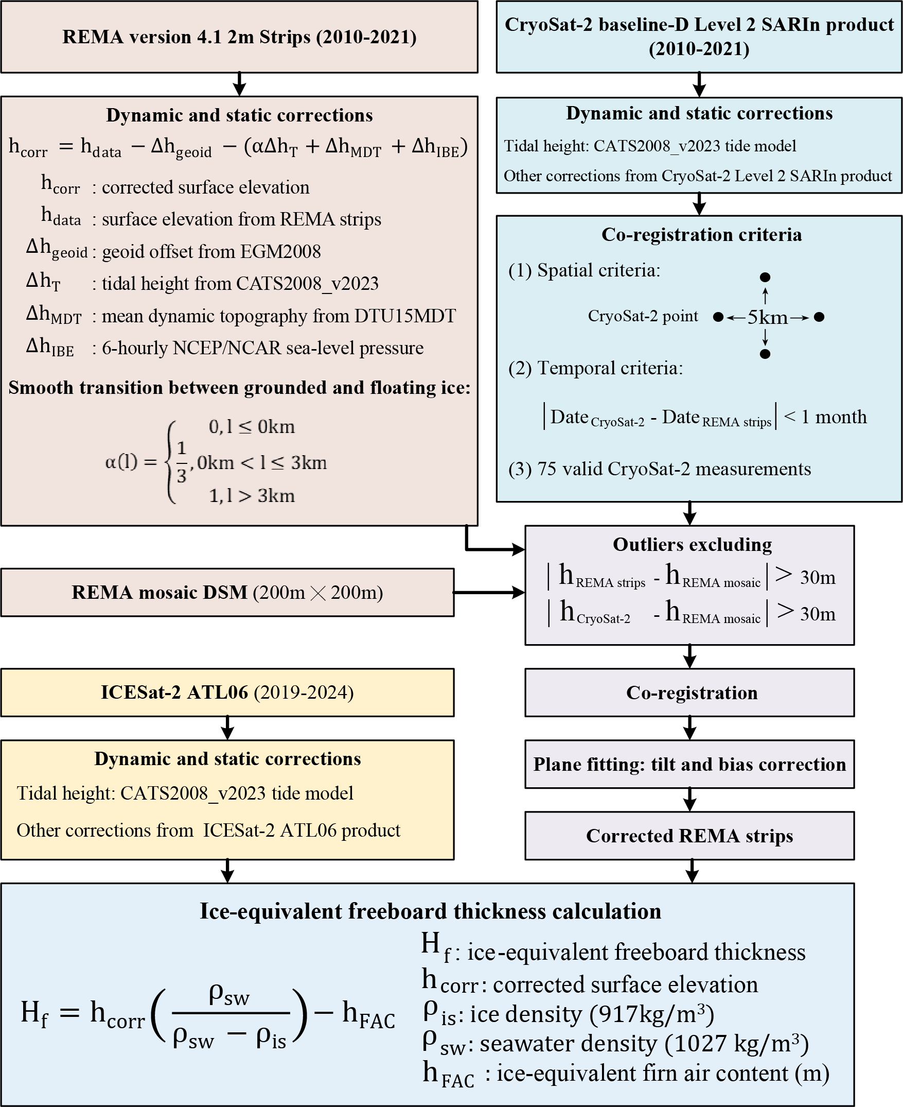 To assess the accuracy of the corrected REMA strips, we compared three strips from 2019–2021 with nearly contemporaneous ICESat-2 ATL06 data (Smith et al., 2019, 2023). The ICESat-2 elevations were converted to heights relative to the instantaneous sea surface by referencing them to the EGM2008 geoid and applying corrections for ocean tides, mean dynamic topography, and the inverse barometer effect. Processing steps see Fig. 5. At overlapping locations, we excluded measurements with ICESat-2 elevation errors exceeding 5 m and calculated the mean elevation difference (REMA minus ICESat-2) and the standard deviation of this bias. As shown in Table 2, the corrected REMA strips exhibited lower standard deviations compared to the uncorrected data, indicating reduced uncertainty. However, a consistent negative mean bias remained, with the corrected REMA elevations appearing systematically lower than those from ICESat-2.