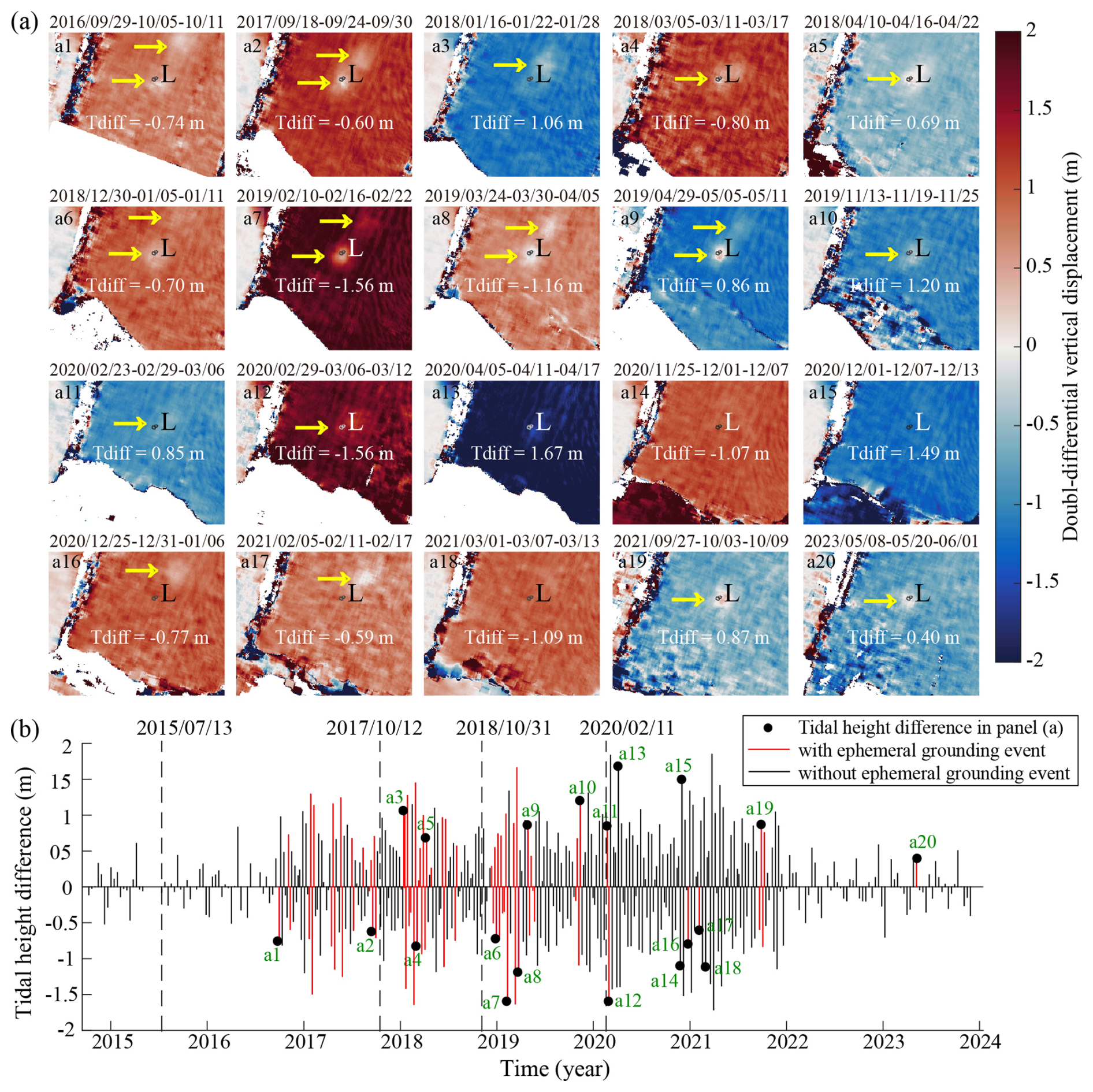 Figure 6Two-dimensional double-differential vertical displacement changes and time series of double-differential tidal height differences. (a) Spatial distribution of double-differential vertical displacement changes between November 2016 and May 2023. Yellow arrows highlight inferred ephemeral grounding signals in each displacement map. The tidal height difference (Tdiff) is labelled in each frame. (b) Time series of double-differential tidal height differences (black vertical lines) and inferred ephemeral grounding events (red vertical lines). Dashed lines indicate the timing of four major calving events: 13 July 2015, 12 October 2017, 31 October 2018, and 11 February 2020.
