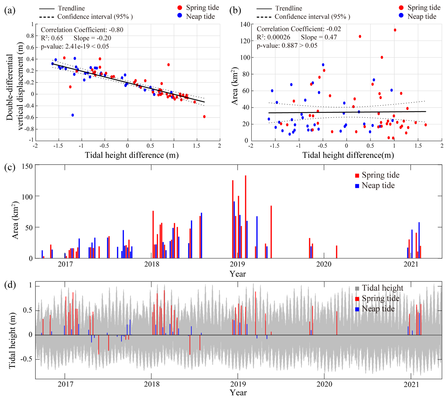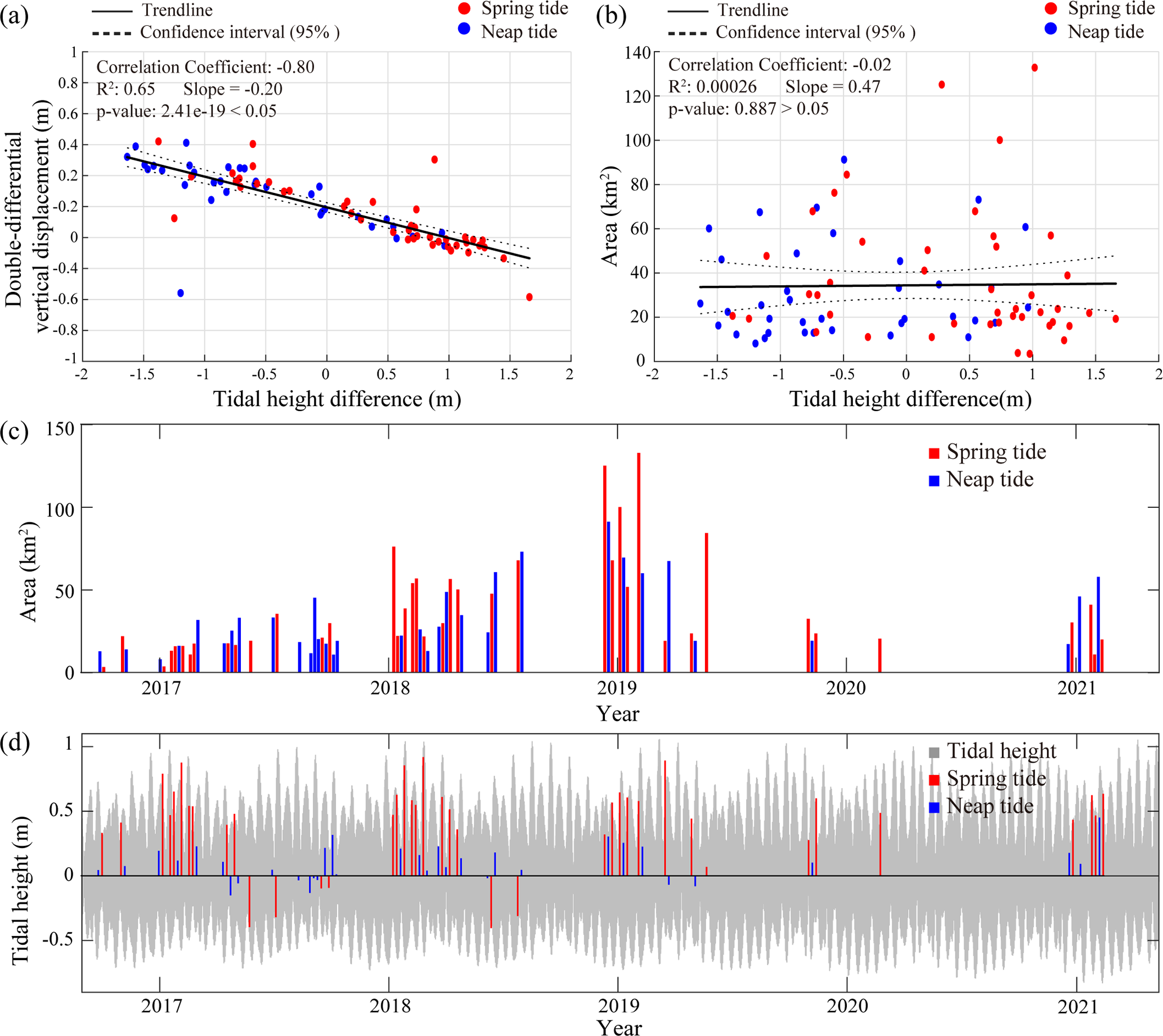 Figure 7Comparison of tidal height differences with double-differential vertical displacement, comparison of tidal height differences and area of grounding region, including time series of area and tidal height variations. (a) Scatter plot of tidal height difference versus double-differential vertical displacement, showing a strong negative linear correlation between the two variables (, , R2=0.65). (b) Scatter plot of tidal height versus area of zero vertical displacement region, indicating weak relationship between the two datasets (, , R2=0.00026). (c) Time series of changes in ice rumple area. (d) Time series of tidal height changes, where 0 represents mean sea level. In all panels, blue vertical lines or points indicate ephemeral grounding events during the neap tide period, while red vertical lines or points represent those during the spring tide period.