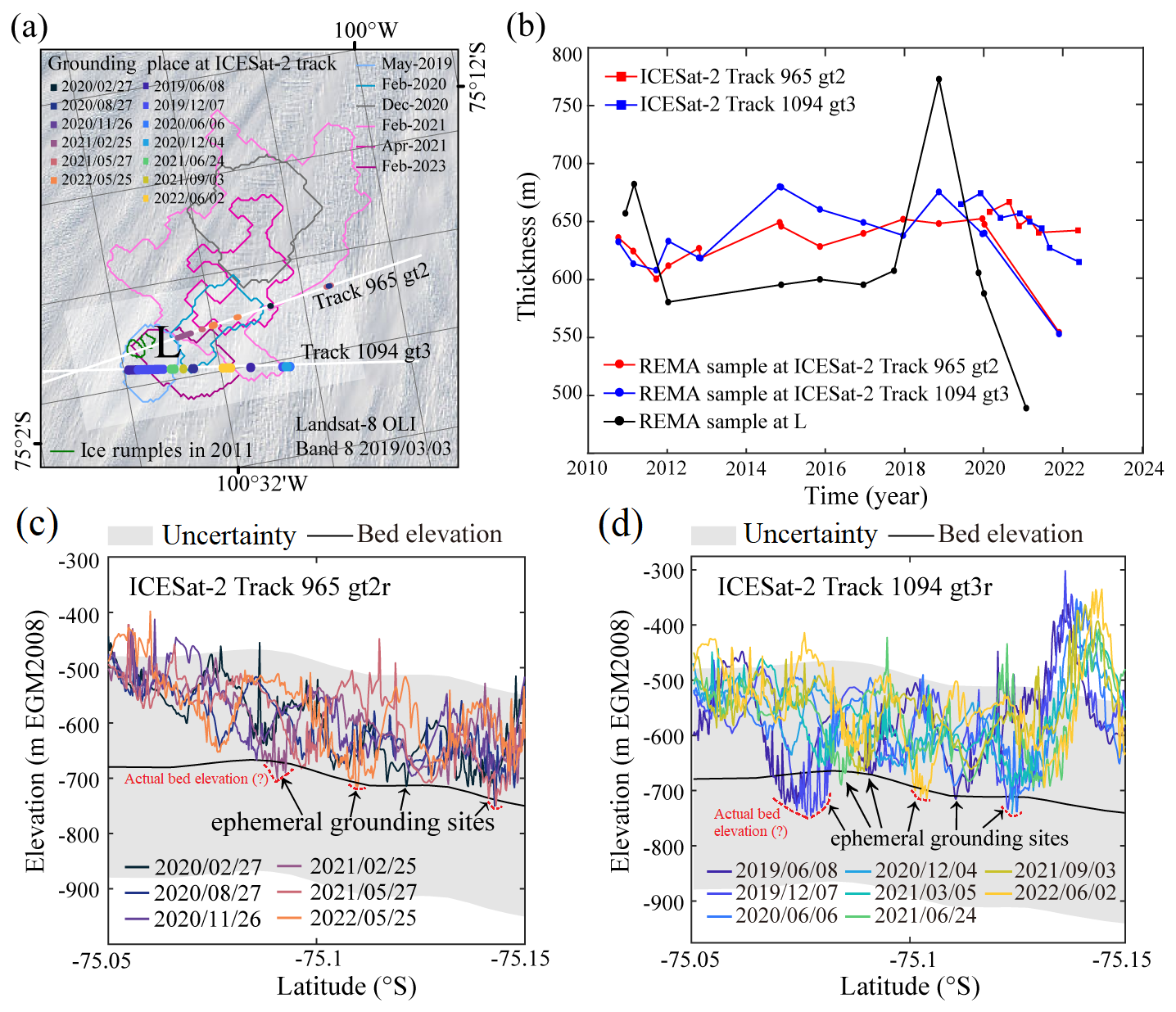 Figure 9Time series of mean ice-equivalent freeboard thickness and ice shelf bottom elevation profiles along ICESat-2 tracks 965 and 1094. (a) ICESat-2 tracks 965 and 1094 that were used for ice-equivalent freeboard thickness change analysis and grounding lines near the ice rumple L from April 2011–February 2021. Background is from Landsat-8 OLI optical image on 3 March 2019. (b) Time series of mean ice-equivalent freeboard thickness (2010–2022). Mean ice-equivalent freeboard thickness from ICESat-2 was calculated along tracks 965 and 1094 between 75.15 and 75.05° S, representing the mean of measurements from both the strong and weak ICESat-2 beams. REMA thickness values were sampled at the same locations as the ICESat-2 tracks. (c) Ice shelf bottom elevation profiles along ICESat-2 track 965 gt2r between February 2020 and May 2022. (d) Ice shelf bottom elevation profiles along ICESat-2 track 1094 gt3r between June 2019 and June 2022. Bed elevations are from the BedMachine v3 dataset (Morlighem et al., 2020; Morlighem, 2022), converted from EIGEN-6C4 to the EGM2008 geoid to match the vertical datum of REMA strips. The estimated vertical uncertainty is ±200 m (shown as a grey transparent box). The potential actual bed elevation is marked by a red dashed line.