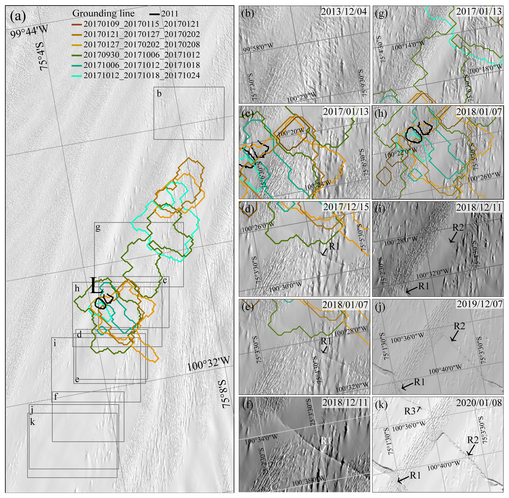 Figure 10Rift propagation history from 2013–2019. (a) Overview map showing the positions of panels (b–k). The background image is a Landsat-8 panchromatic image from 4 December 2013. (b–k) show the propagation history of the rifts R1, R2 and R3 (black or white arrow), which led to the 2020 calving event. The black circles indicate the positions of ice rumple L. Grounding lines are delineated based on the near-zero value of the double-differential vertical displacement.