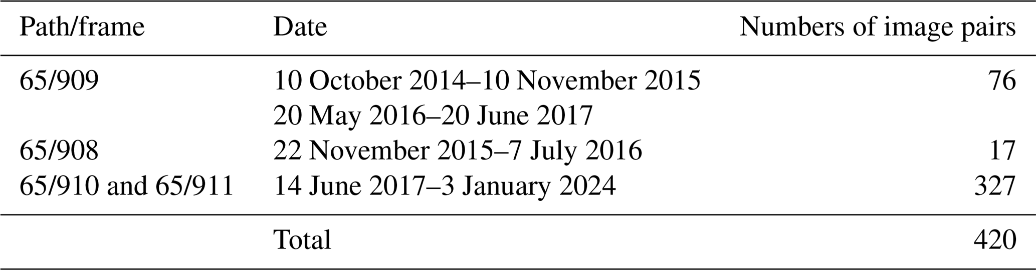 To reduce noise and remove outliers in the Sentinel-1 offset tracking data, we employed a multi-step filtering and calibration approach. First, we retained only pixels with a normalized cross-correlation value greater than 0.05, which also used by Solgaard et al. (2021) to ensure reliable displacement measurements. Second, we extracted the residual displacement at 458 widely distributed, non-moving points over the exposed bedrock (Fig. 1). Outliers beyond one standard deviation were removed, following the same criteria that used in Chen et al. (2020), and the mean residual displacement for each time interval was calculated and used to calibrate the displacement maps by subtracting this mean value. To further remove noise and erroneous measurements, we examined the distribution of azimuth and range displacements across the entire time series and established empirical thresholds based on reasonable minimum and maximum velocities of ice movement at PIIS. We invalidated pixels with slant range displacements less than −60 m or greater than 75 m for 6 d gaps, and less than −120 m or greater than 150 m for 12 d gaps, which can exclude a small portion of pixels and improved the consistency and quality of the final displacement fields.