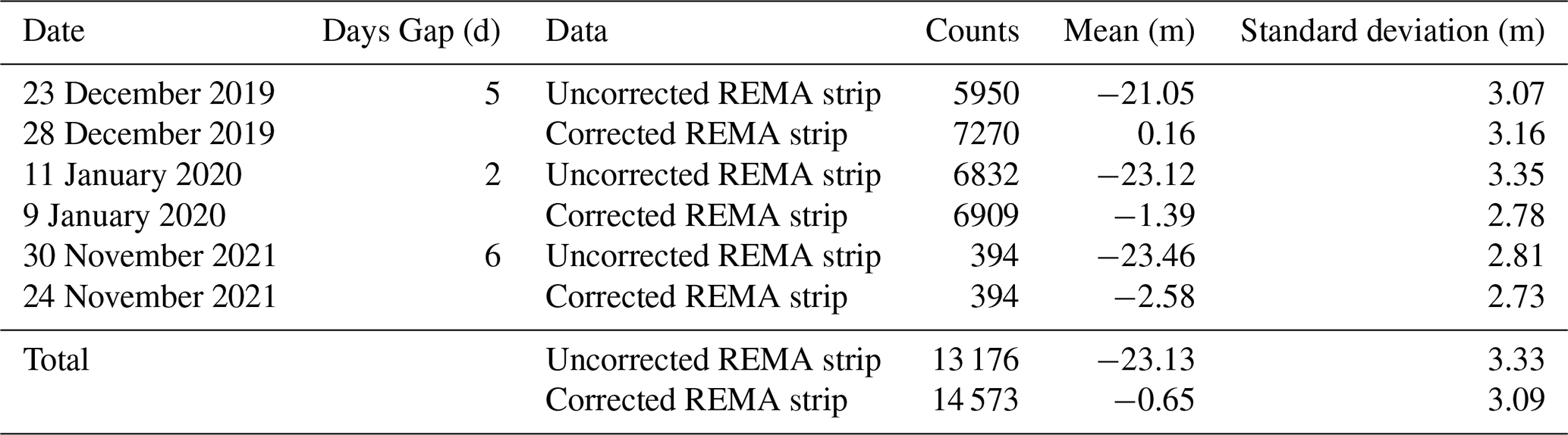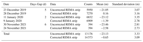 Table 2The means and standard deviations of uncorrected and corrected REMA strip elevations minus the ICESat-2 elevation.