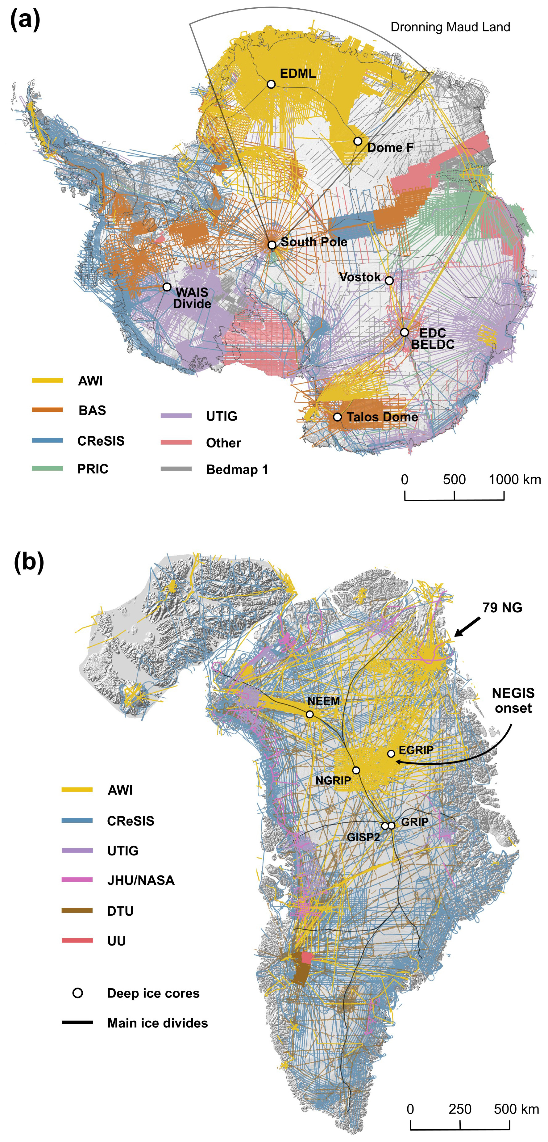 Figure 1Institutes with substantial radar profile coverage in (a) Antarctica and (b) the Arctic: Alfred Wegener Institute (AWI), British Antarctic Survey (BAS), Centre for Remote Sensing and Integrated Systems (CReSIS), Polar Research Institute of China (PRIC), University of Texas Institute of Geophysics (UTIG), John Hopkins University (JHU), Techical University of Denmark (DTU), Upsalla University (UU), and other institutes (see Morlighem et al., 2017, and Karlsson et al., 2024, for details in Greenland and Bingham et al., 2025, for details in Antarctica). For the AIS the radar data coverage of the Bedmap 1 period is shown in grey in the background. The black lines represent the main ice divides from Mouginot et al. (2017) and Rignot et al. (2019) and the white circles deep ice-core locations. Note that the spatial scale for Greenland is twice as large as for Antarctica. The two arrows in (b) highlight the Nioghalvfjerdsfjorden Glacier (79° NG) and the onset region of the Northeast Greenland Ice Stream (NEGIS).