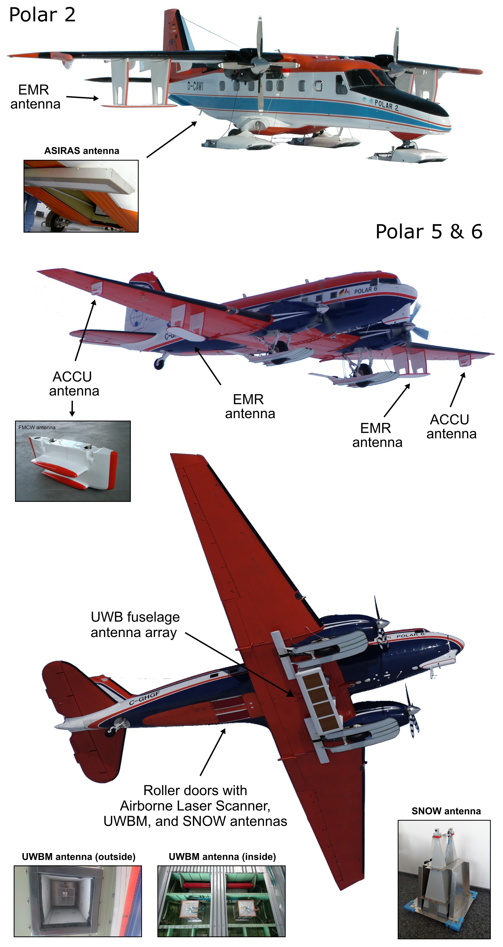 Figure 2AWI's polar aircraft Polar 2 (Dornier Do228; registration code: D-CAWI), Polar 5 (Basler BT-67; registration code: C-GAWI), and Polar 6 (Basler BT-67; registration code: C-G HGF) and the six AWI radar systems. The bottommost picture of the airplane shows the fuselage antenna of the UWB system, without wing antennas mounted. The bottommost photo of the Basler aircraft was taken by Sepp Kipfstuhl (AWI). All other photos were taken by the authors of this manuscript.