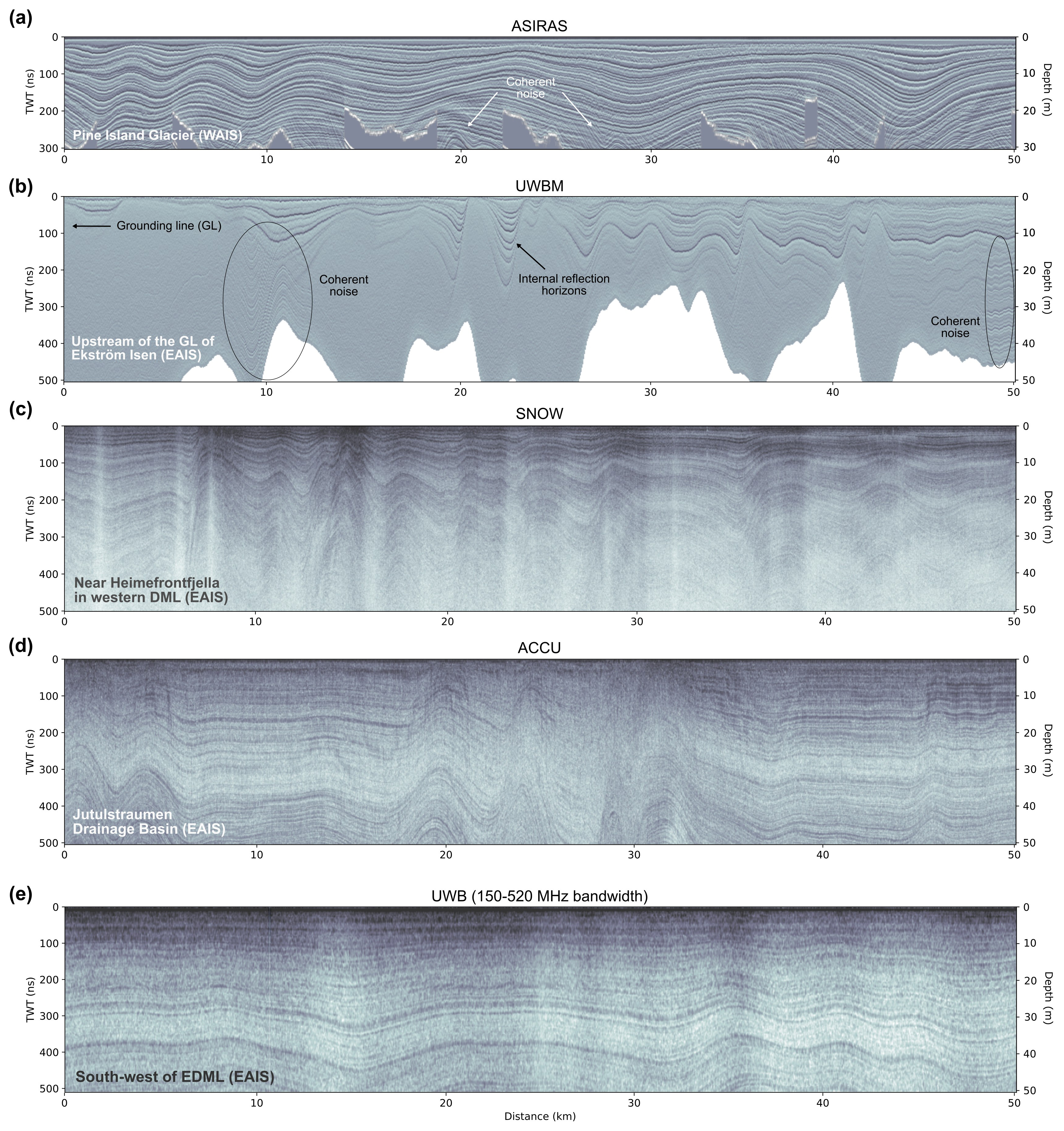 Figure 4Examples of radargrams focusing on the first 50 m depth below the surface. (a) ASIRAS; profile ID: ASR_L1B_01_20141203T130418_132058, (b) UWBM; profile ID: 20221205_99_[019–021], (c) SNOW; profile ID: SNOW_20140102T074743_081922, (d) ACCU; profile ID: ACCU_20131230T090855_094516, (e) UWB in wideband mode; profile ID: 20231211_02_006. For TWT-to-depth (two-way travel time) conversion we used an average electromagnetic wave speed in the upper 50 m of 2×109 m s−1, which corresponds to an average ordinary relative dielectric permittivity of 2.25. The location of the radar profile is annotated in the lower left corner of the radargram and shown in Fig. 3. All radargrams are time-zeroed at the ice surface reflection.