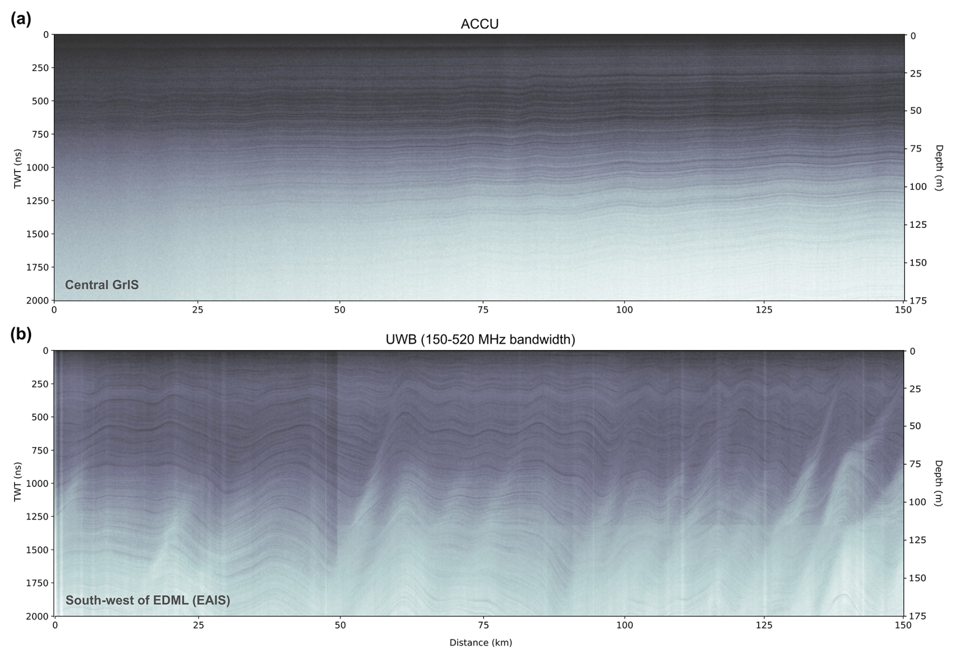 Figure 5Examples of radargrams focusing on the first ∼ 175 m depth below the surface. (a) ACCU; profile ID: ACCU_20100722T132929_140949, (b) UWB in wideband mode; profile ID: 20231211_02_[008–010]. For TWT-to-depth (two-way travel time) conversion we used an average electromagnetic wave speed in the upper 175 m of 1.75×109 m s−1, which corresponds to an average ordinary relative dielectric permittivity of 3.0. The location of the radar profile is indicated in the lower left corner of the radargram and shown in Fig. 3. All radargrams are time-zeroed at the ice surface reflection.
