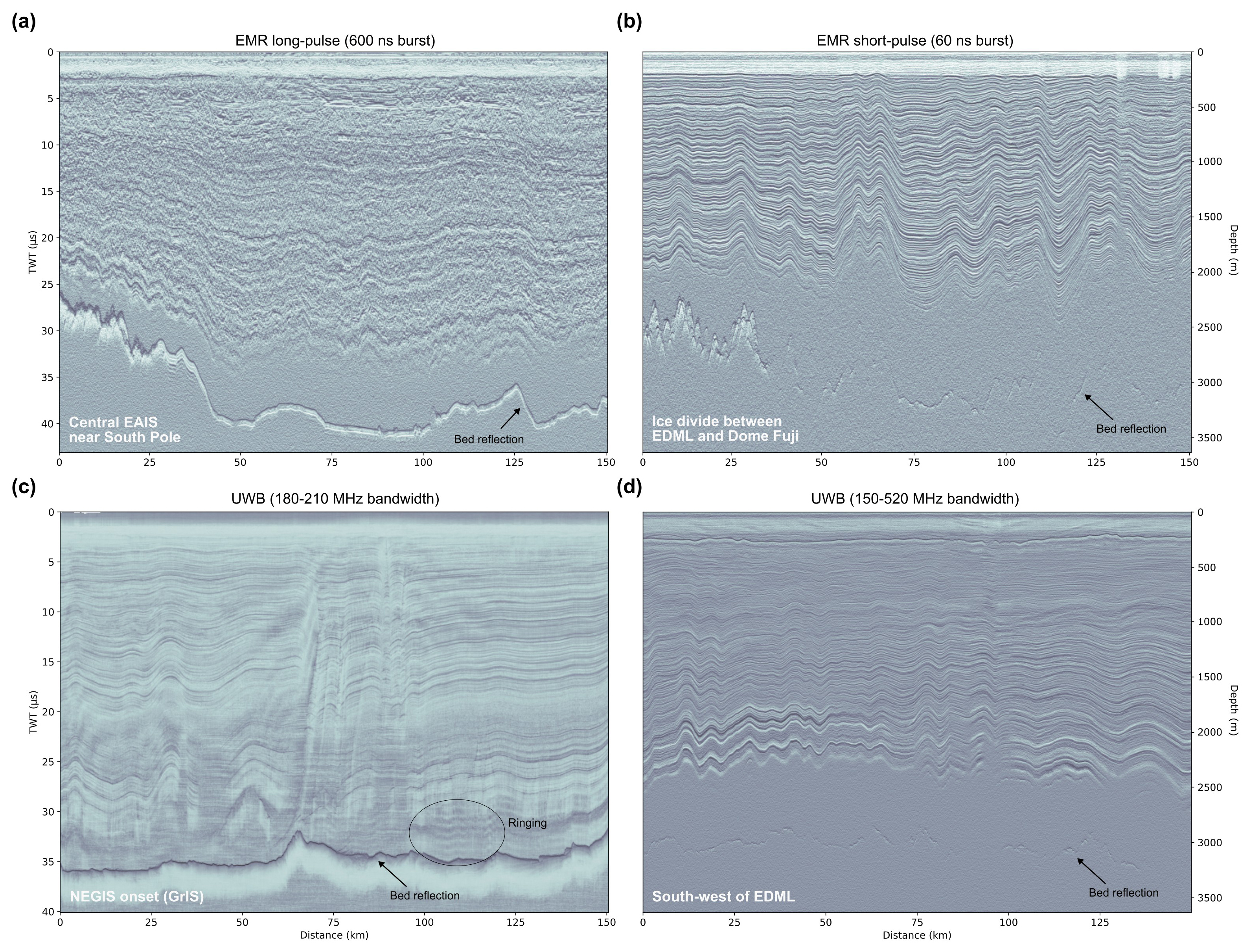 Figure 6Examples of deep-sounding radargrams. (a) EMR long-pulse; profile ID: 20112120, (b) EMR short-pulse; profile ID: 20033141, (c) UWB narrowband; profile ID: 20180510_01_013, (d) UWB wideband; profile ID: 20231211_02_006–008. For TWT-to-depth conversion we used an average electromagnetic wave speed of 1.689×109 m s−1, which corresponds to an average ordinary relative dielectric permittivity of 3.15. The location of the radar profile is indicated in the lower left corner of the radargrams and shown in Fig. 3. All radargrams are time-zeroed at the ice surface reflection.