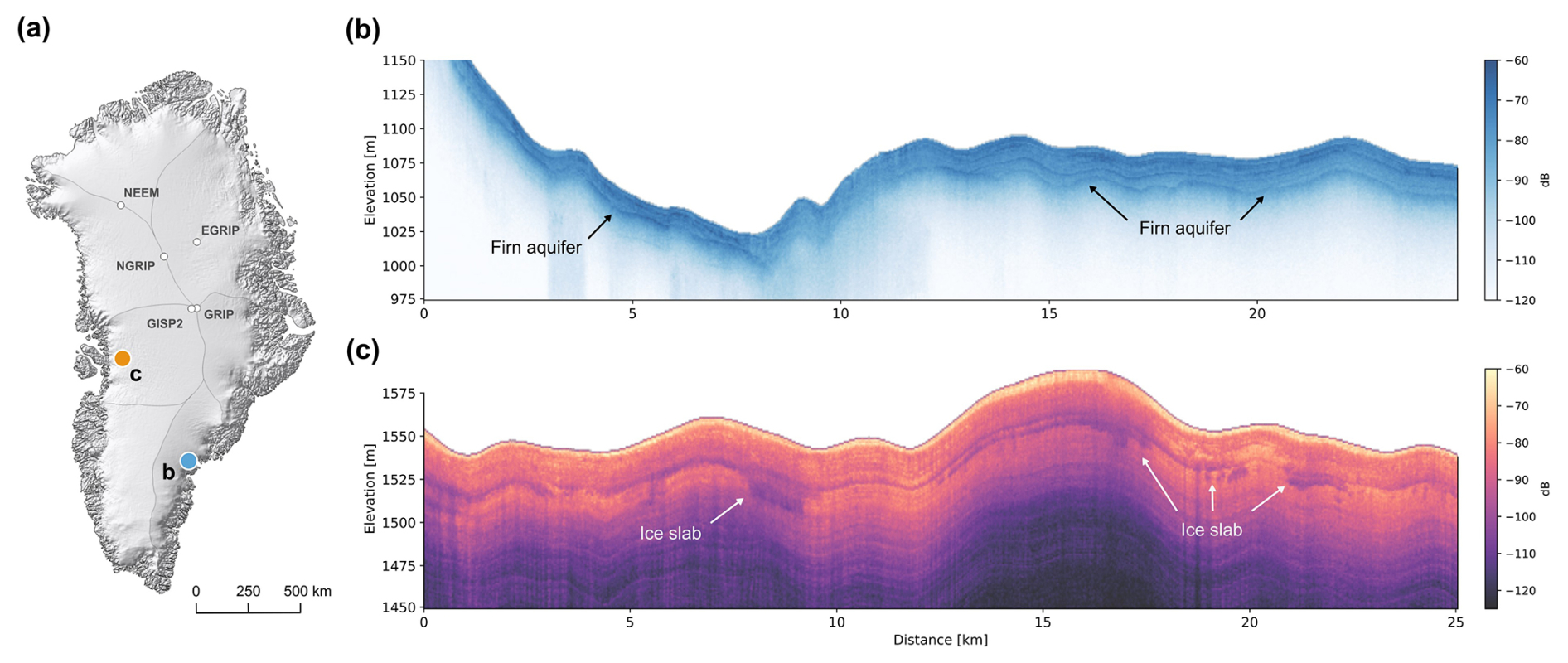 The snow radar system (SNOW) is a FMCW system transmitting in a frequency range of 8–12 GHz. It was developed by the TU Hamburg-Harburg (Germany). The system operates with a transmit power of up to 3.2 W and a sampling rate of 500 MHz. The penetration depth is limited to the upper 10–20 m (Fig. 4c) with decreasing signal to noise ratio with depth. The theoretical range resolution is ∼ 2 cm and trace spacing depends on the trace coordinate accuracy and varies between 10 and 40 m.