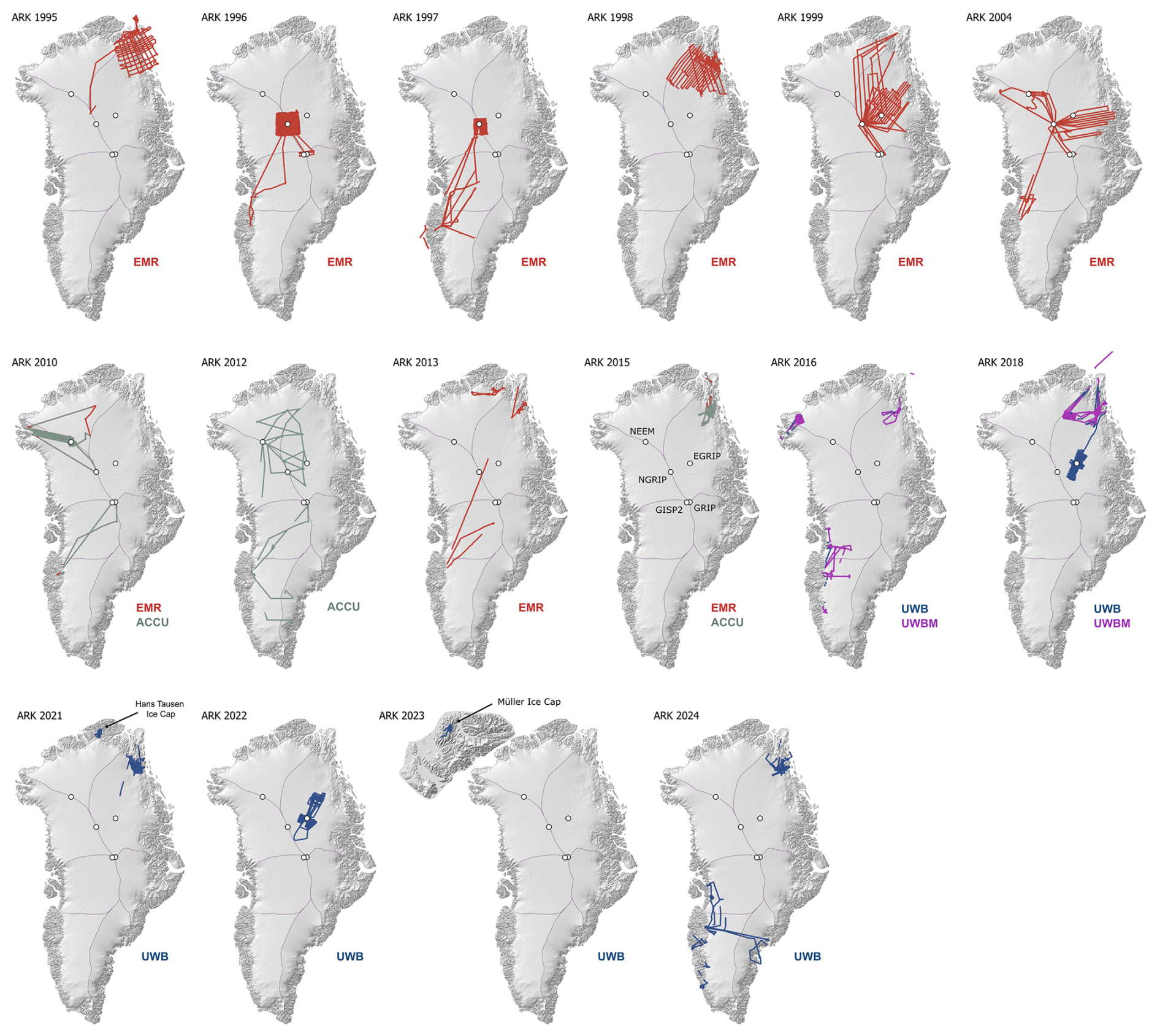 The EMR system has been extensively used in Greenland, primarily in the northeast where it covers all major deep ice core drilling sites (NEEM, NorthGRIP, EastGRIP, and GRIP). Some surveys extend towards the northwest and southwest. In 1996, the NorthGRIP drilling site was covered by extensive grid surveys.