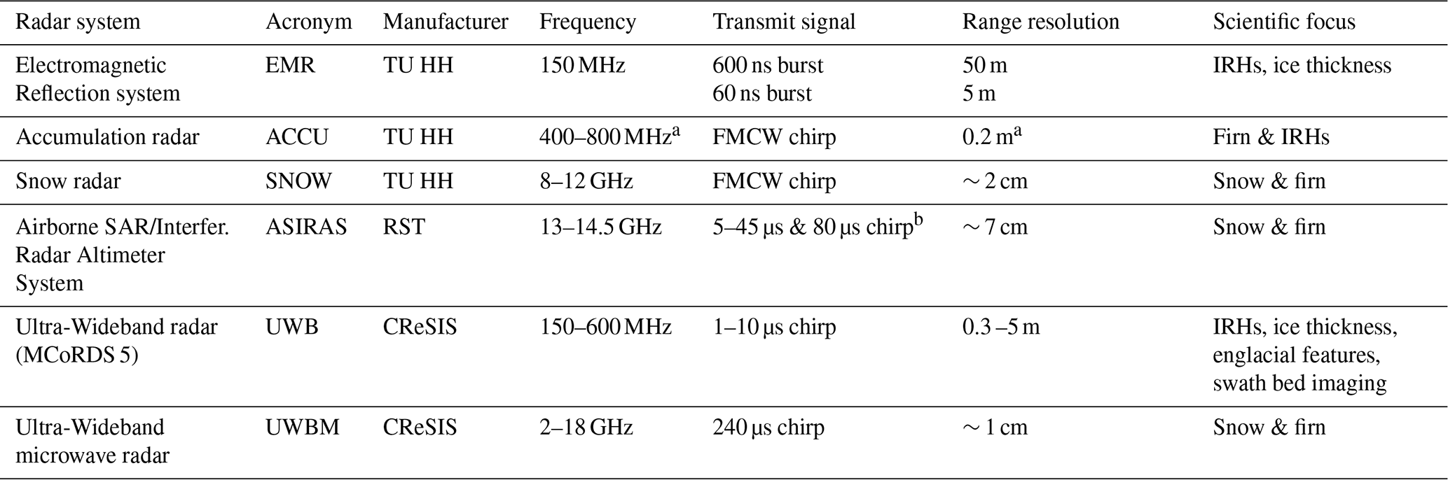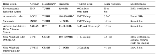 Table 1AWI radar system specifications. Abbreviations: TU HH = Technical University Hamburg-Harburg; RST = Radar Systemtechnik; MCoRDS = Multi-channel Coherent Radar Depth Sounder; FMCW = Frequency-Modulated-Continuous-Wave; IRH = Internal Reflection Horizon.
