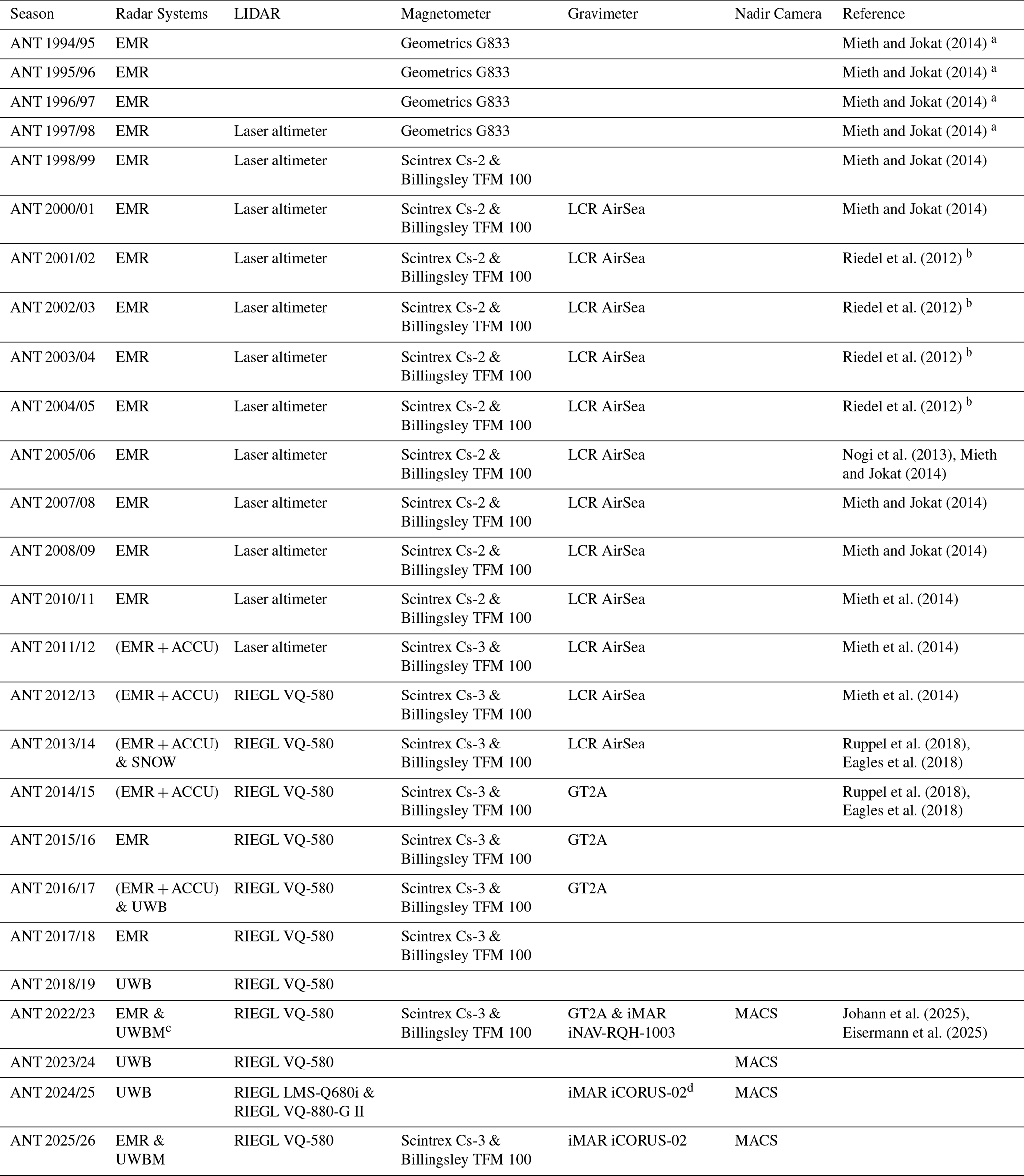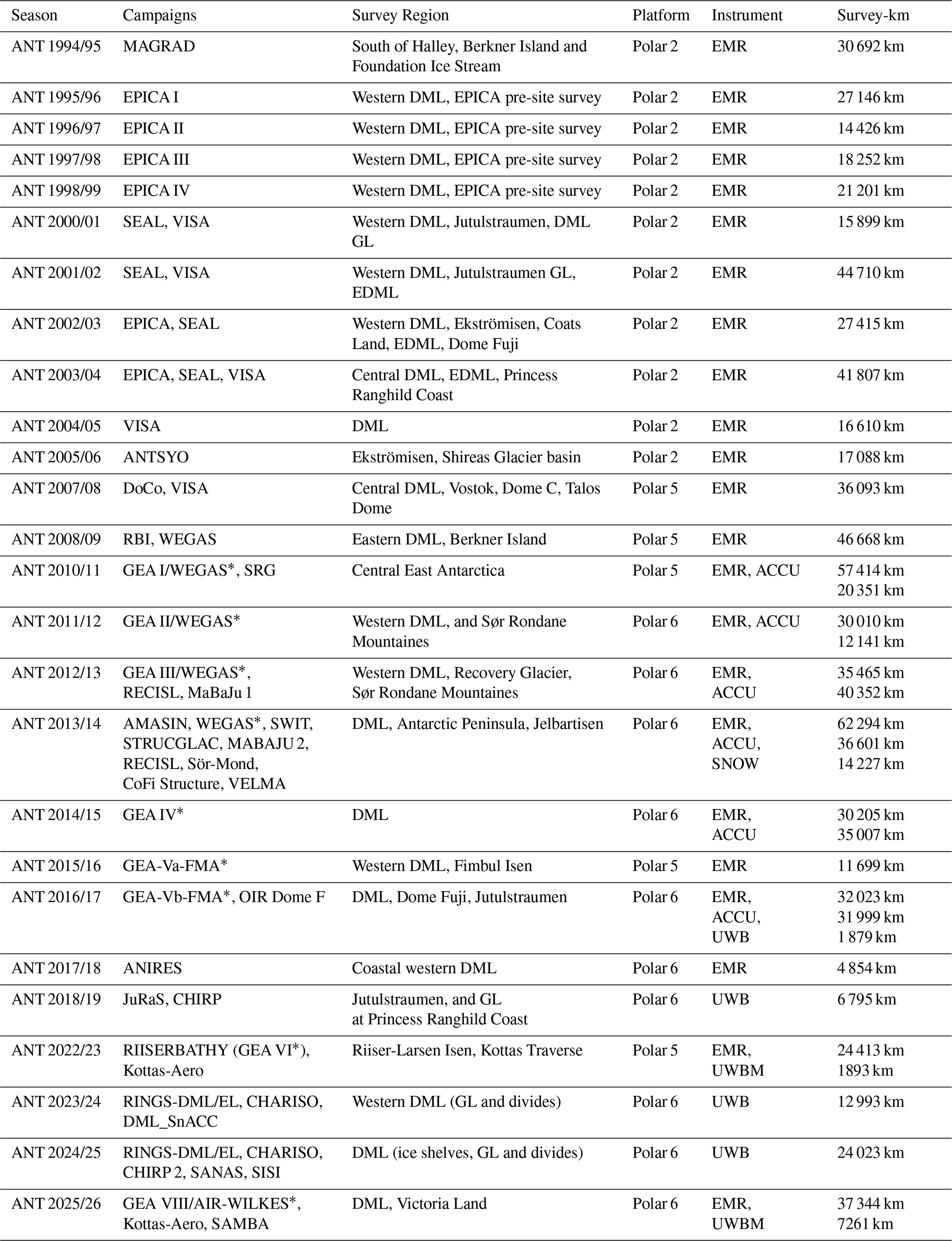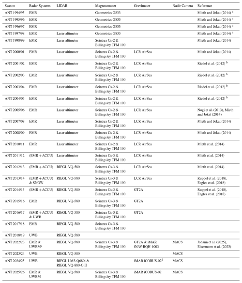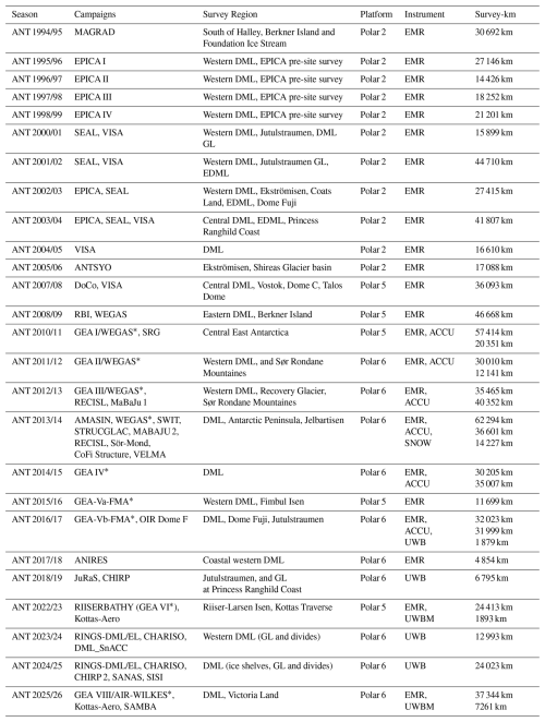 The first deployment in Antarctica was conducted during the 2016/17 season, primarily consisting of test flights. In the 2018/19 season, surveys focused on the onset of the Jutulstraumen Glacier (e.g., Franke et al., 2021a, 2025b) as well as the area around the grounding line of the Roi Baudouin Ice Shelf and nearby Derwael Ice Rise (e.g., Koch et al., 2023; Zhou et al., 2025). During the 2023/24 and 2024/25 seasons, additional measurement flights were conducted directly at the grounding line in Dronning Maud Land, their aims led by the goals of the SCAR Action Group RINGS (Matsuoka et al., 2025), as well as flights mapping deep englacial stratigraphy (Franke et al., 2025b) and near-surface stratigraphy (Zuhr et al., 2026).