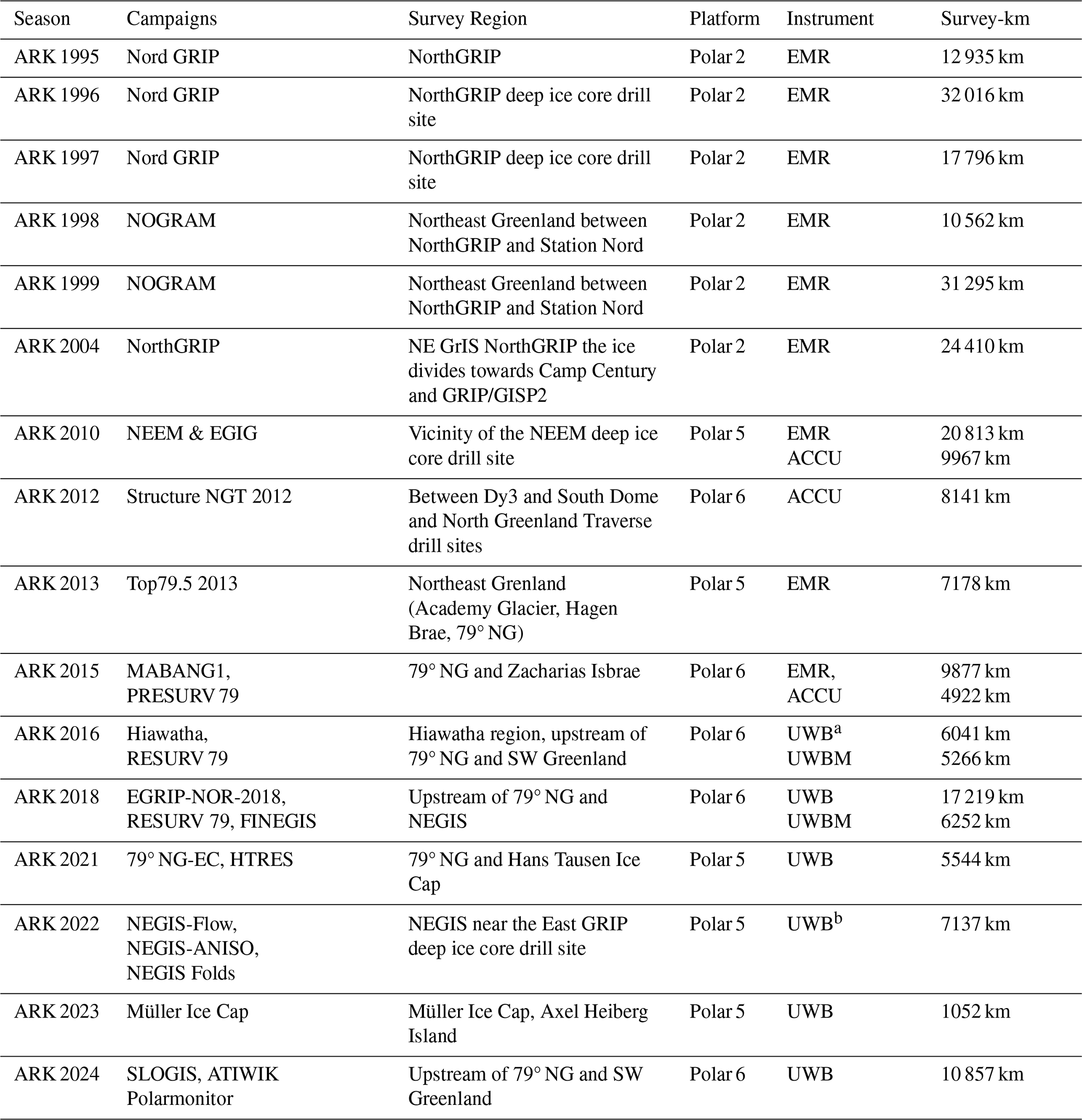 Between 2018 and 2022, UWB flights in Greenland focused on the area around the EastGRIP drilling site (e.g., Franke et al., 2022c) and the upstream region of the Nioghalvfjerdsfjorden Glacier (79° NG; Zeising et al., 2024). In 2018 and 2022, swath flights were conducted in the immediate vicinity of the EastGRIP ice core, producing a high-resolution (25 m horizontal resolution) DEM of the bed topography and landforms (Carter et al., 2025a). In the 2022 survey, radar profiles were collected in full polarimetric mode around NEGIS (Eisen et al., 2025) providing insights into englacial properties of this ice stream at comparable data quality of local ground-based polarimetric surveys in this region (Gerber et al., 2025; Nymand et al., 2025). Furthermore, in 2023, a campaign took place in the Canadian Arctic on the Müller Ice Cap to explore a suitable coring site (Lilien et al., 2024) and in 2024, flights were conducted both upstream of the 79° NG and in Southwest Greenland.