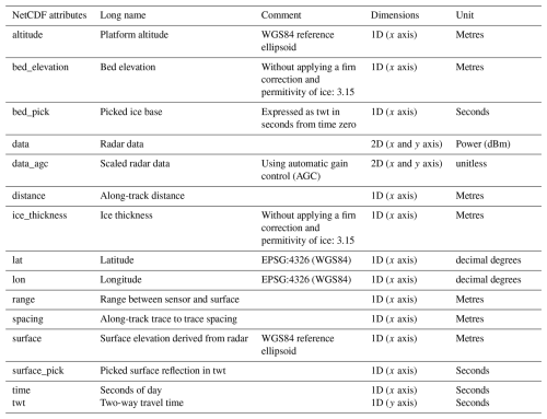 Technical parameters of the radar systems are presented in Table 1. Example radargrams from the individual systems can be found in Figs. 4, 5, and 6. An overview of the workflow from data acquisition to archiving, analysis, and public availability is illustrated in the flow chart diagram in Fig. 7. The coverage of radar profiles for each radar system is shown in Figs. 8 and 9 (organized by radar system) and in Figs. A1 and A2, as well as Tables A1 and A2 (organized by season and campaign).