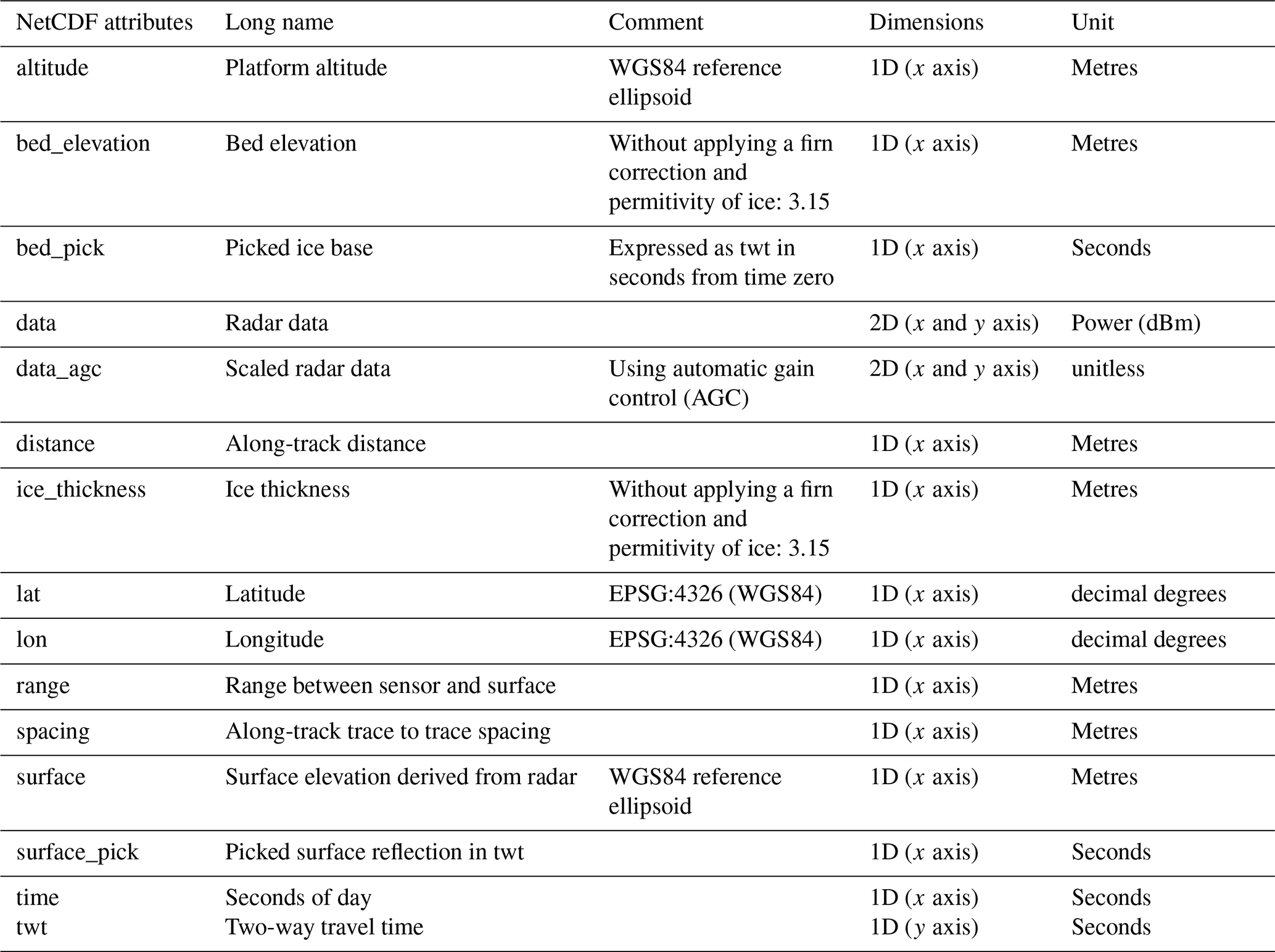 Winter, A., Steinhage, D., Arnold, E. J., Blankenship, D. D., Cavitte, M. G. P., Corr, H. F. J., Paden, J. D., Urbini, S., Young, D. A., and Eisen, O.: Comparison of measurements from different radio-echo sounding systems and synchronization with the ice core at Dome C, Antarctica, The Cryosphere, 11, 653–668, https://doi.org/10.5194/tc-11-653-2017, 2017. a, b