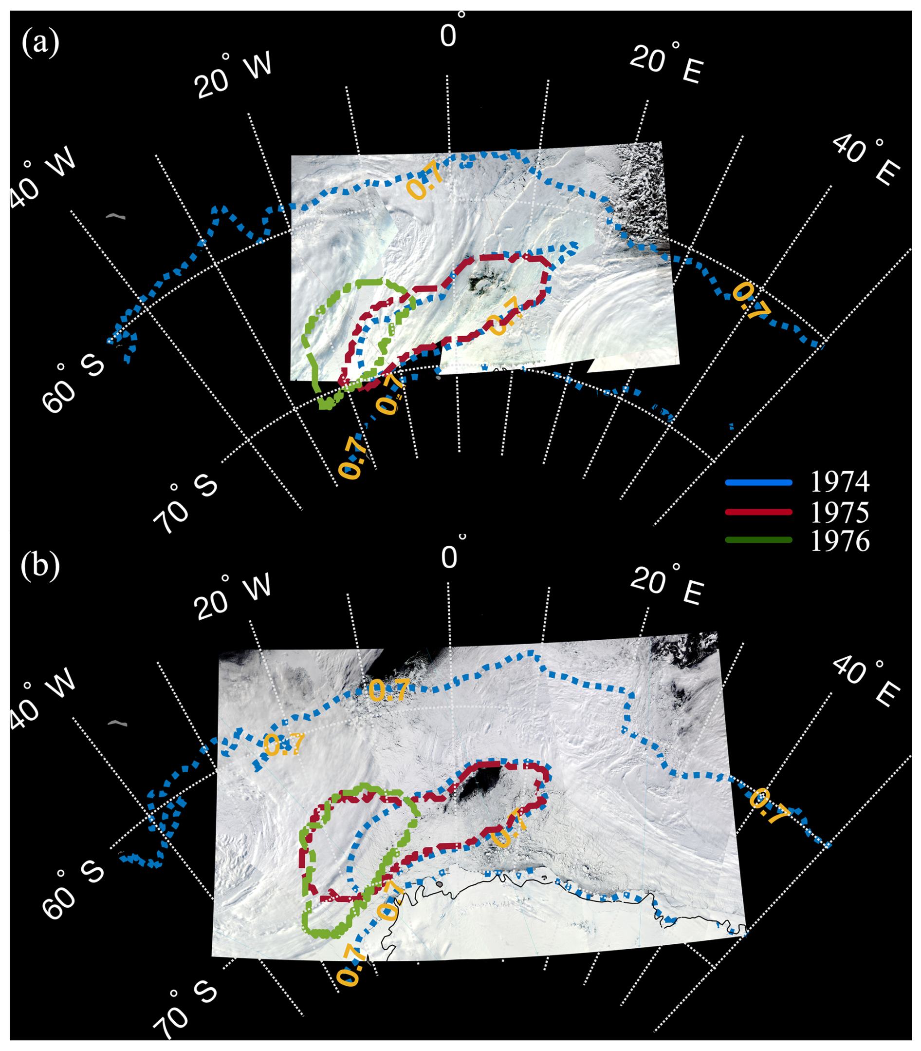 Figure 2Optical images at 500 m resolution from (a) MODIS (Moderate Resolution Imaging Spectroradiometer) on 6 August 2016 and (b) VIIRS (Visible Infrared Imaging Radiometer Suite) on 25 September 2017, showing the polynya. The monthly 70 % sea ice concentration isolines for 1974 (blue), 1975 (red), and 1976 (green) retrieved from ESMR (Electrically Scanning Microwave Radiometer) are overlaid, representing the polynya area (threshold: 70 %). The isolines correspond to (a) August and (b) September.