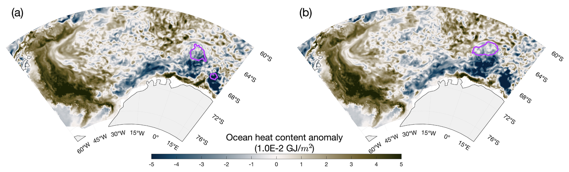 Figure 4CMEMS monthly upper ocean (0–300 m) heat content anomaly (deviation from the 1993–2023) during 2016 and 2017 in (a) August and (b) September. The purple isolines are the polynya detection based on 70 % sea ice concentration threshold.