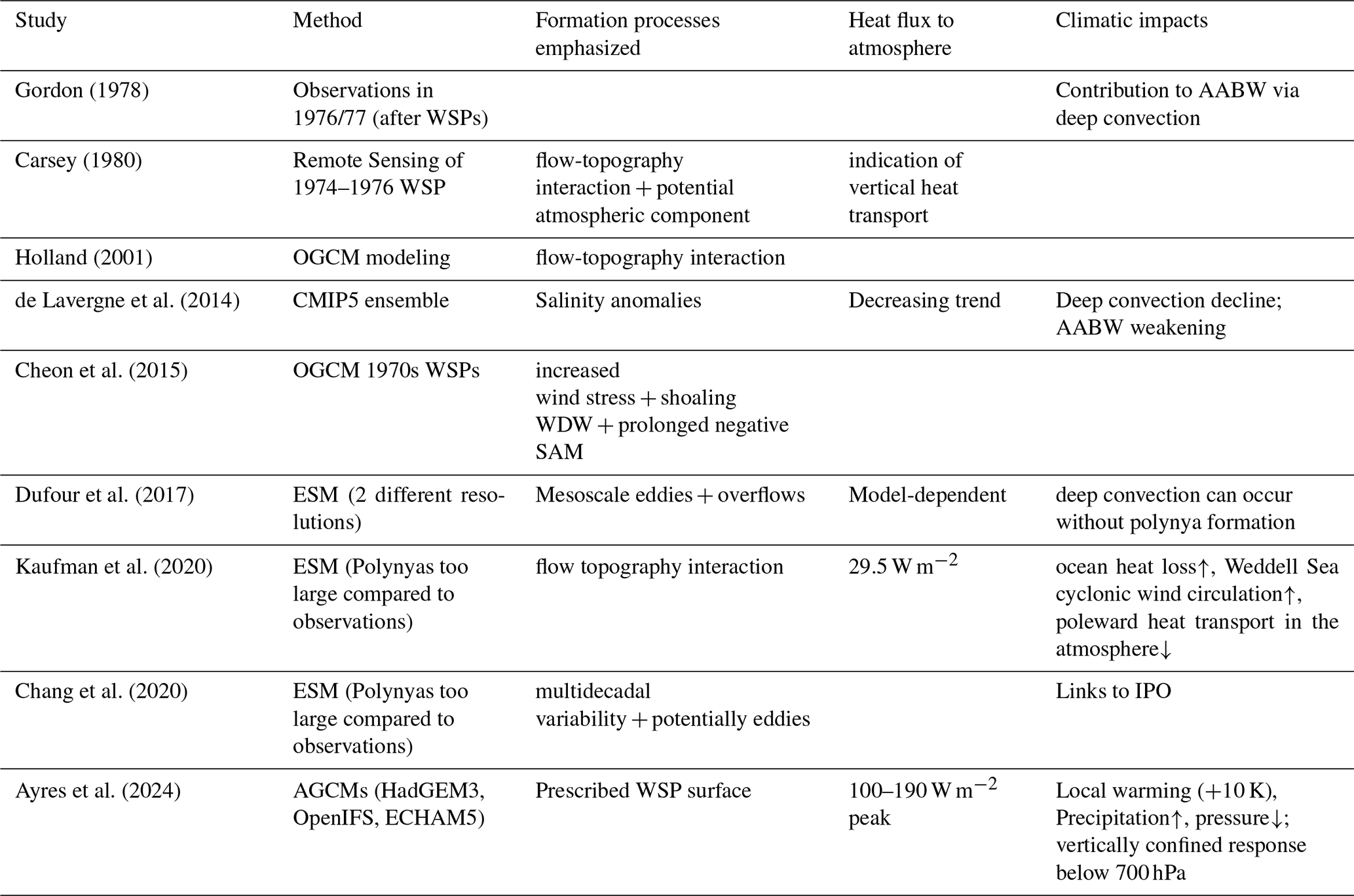 Gordon (1978)Carsey (1980)Holland (2001)de Lavergne et al. (2014)Cheon et al. (2015)Dufour et al. (2017)Kaufman et al. (2020)Chang et al. (2020)Ayres et al. (2024)Table 1Summary of key findings from major observational and modeling studies on Weddell Sea polynyas, highlighting agreement and divergence in polynya characteristics and impacts.