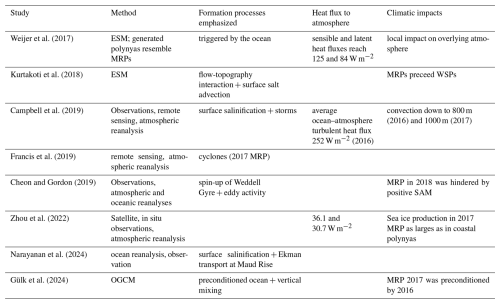 To clarify and compare key differences in formation, magnitude, and impacts across WSP and MRP studies, we provide a synthesis in Tables 1 and 2. The tables highlight observational versus modeled results across key metrics including formation mechanisms, ice production, heat fluxes, and broader climate feedback.