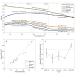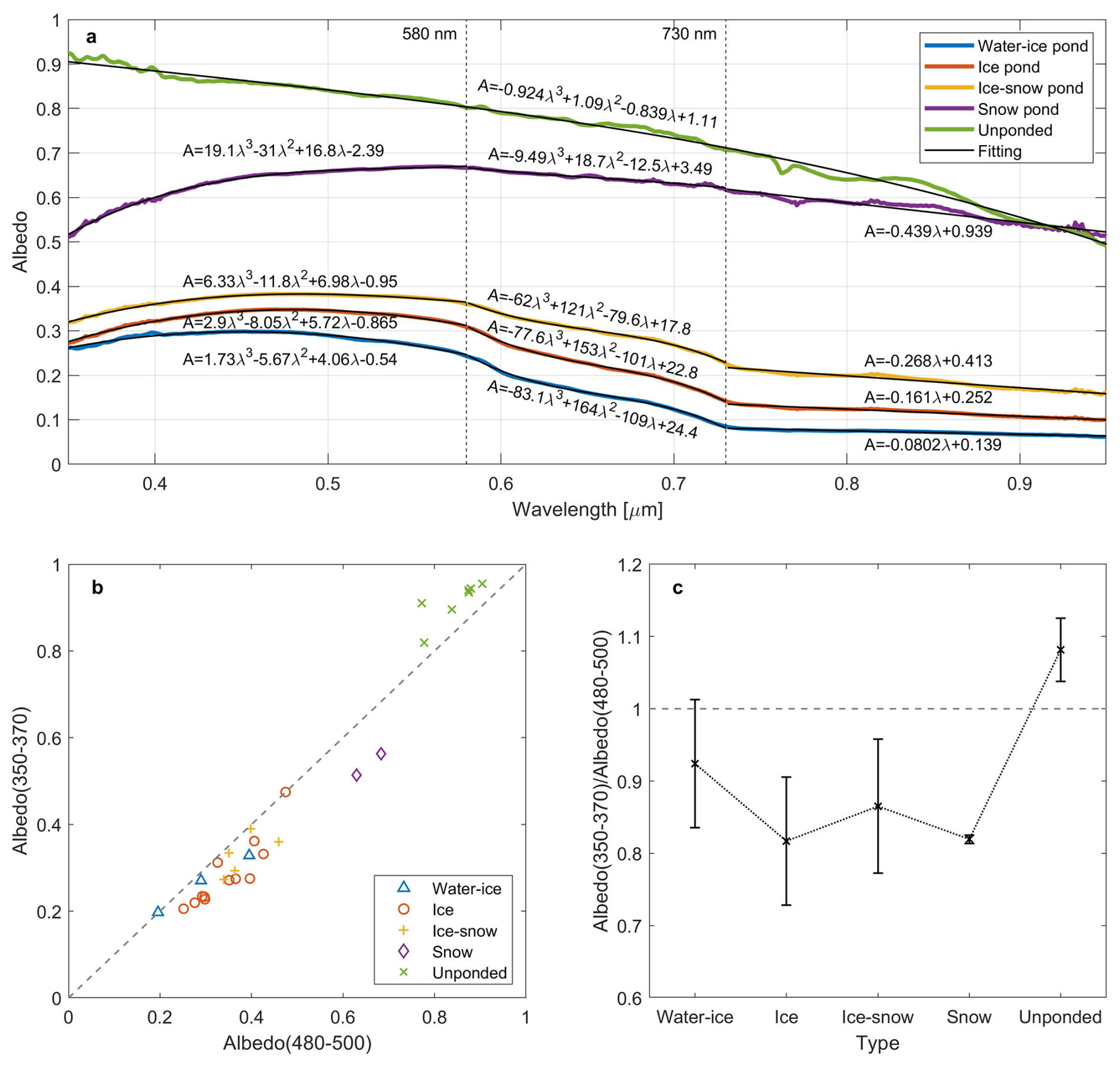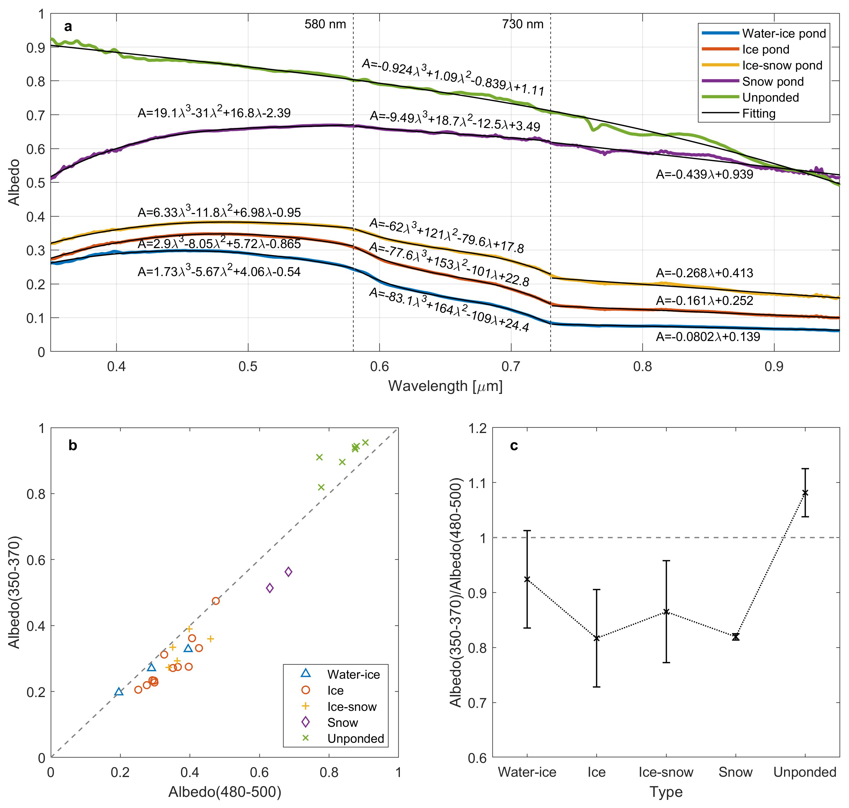 The spectral albedo of ponds with different states is fitted as shown in Fig. 8a. The fitting is performed in segments based on the corresponding spectral distribution pattern separated by 580 and 730 nm. The variation is slow in the first and third segments, while rapid in the second segment. The exception is unponded ice that no segment is performed as its albedo shows no abrupt change on gradients, so a polynomial fit is applied for the full band. It should be noted that the unit of wavelength is µm. The results show regular variations with the refreezing of ponds, which is reflected on the increasing on coefficients in the first and third segments, and decreasing in the second segment. Besides, for unponded ice and snow ponds, there is an obvious nonlinear pattern between 730 and 950 nm, while a slight similar pattern exists on the same band for the rest types which enhances as snow cover accumulates, so it can be considered as the influence of the optical properties of snow. The result is also consistent with observations in Malinka et al. (2016), which reported a similar nonlinear pattern shown both in the observed albedo of snow-covered ponded or unponded ice and in the simulated albedo based on radiative transfer theories.