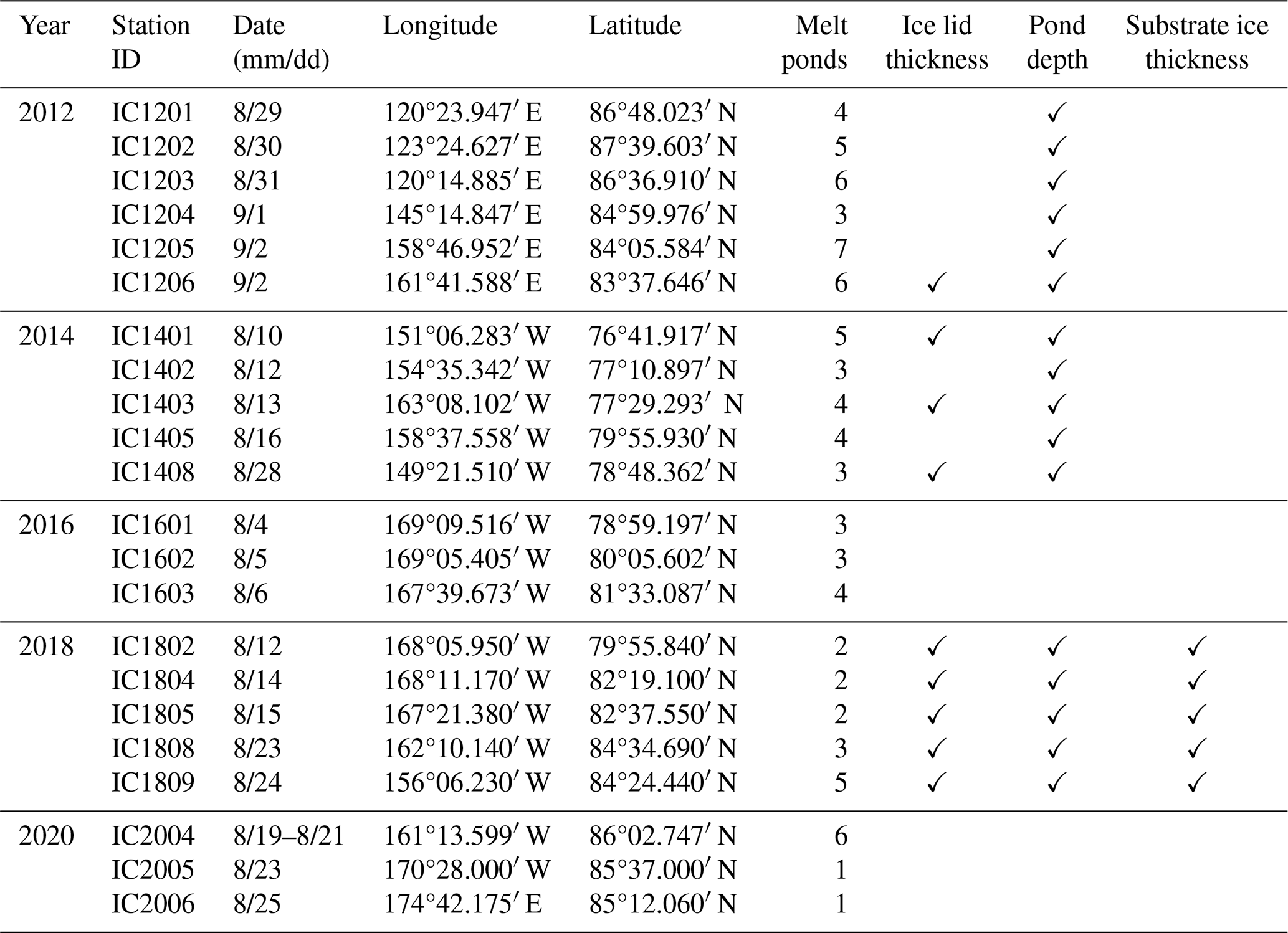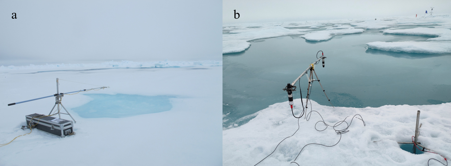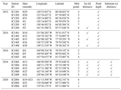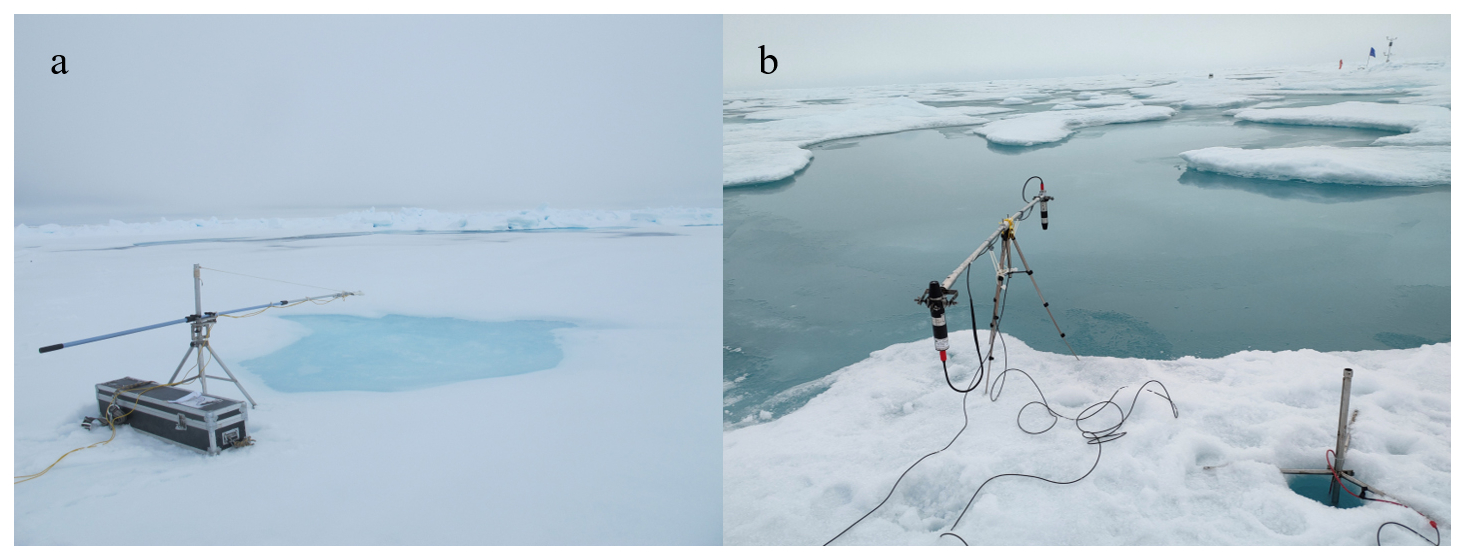 The instruments were mounted at the end of an extension pole which was fixed on a tripod and counterweighted to be parallel with the surface (Fig. 2a, b). This ensured that the sensor for upward irradiance was about 0.8 m above the melt pond, thus reducing the interference from the edges. The surface condition was recorded both by text in the station document and by photo taken with a camera. For the other physical properties, the ice lid thickness was measured by a metal ruler, the pond depth was measured by a metal tape measure, and the substrate ice thickness was measured by an ice thickness gauge. Note that the depth of all melt ponds with a closed bottom were measured, while measurements of the ice lid thickness were performed on selected locations. In addition, the substrate ice thickness was measured in CHINARE 2018.